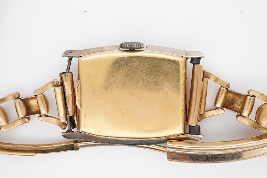 A 1930's Swiss 18ct gold manual wind wrist watch, with tonneau shaped case and Arabic dial with subsidiary seconds, on a gilt metal bracelet, (a.f.).
