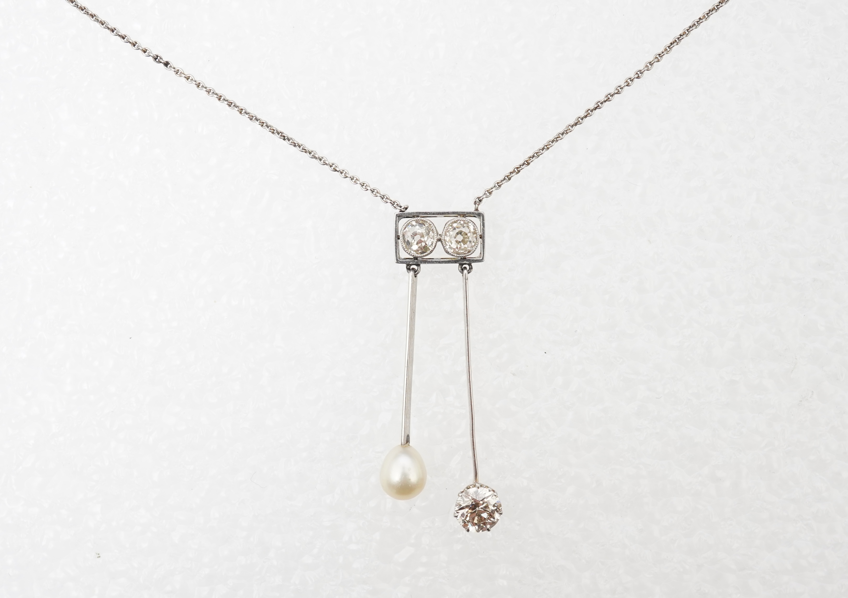 An Art Deco pearl and diamond negligée pendant, 1920s, centring on a pair of cushion-shaped diamonds totalling approximately 0.40 carats within a rectangular knife wire frame, suspending two pendants of asymmetrical lengths, culminating in a pearl measuring approximately 5.7 x 5.7 x 6.9mm, and a circular-cut diamond weighing approximately 0.65 carats, to a fine chain necklace, chain length 42cm, pendant length 3.9cm, pearl untested