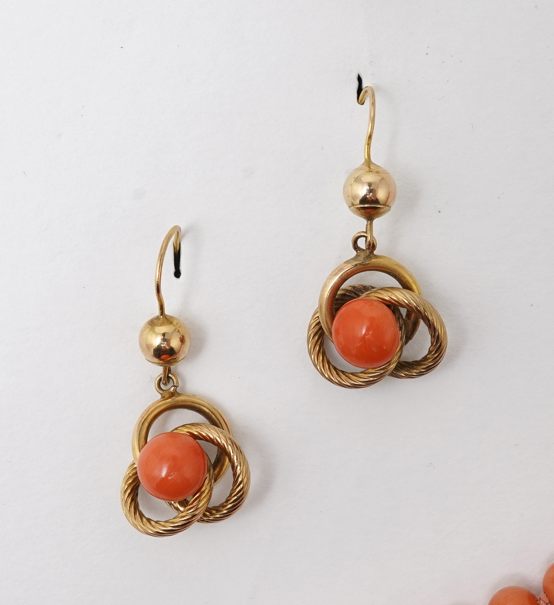 A collection of coral and turquoise jewels, comprising: a coral bead necklace, beads approximately 6-7mm, to a gold spherical clasp, necklace length 102cm, clasp stamped 375, gross weight approximately 61 grams; a pair of earrings of knotted design, set with coral cabochons, length 3.4cm each, hook fittings; and a pair of quatrefoil turquoise and rose-cut diamond earrings, length 1.3cm each, screw fittings, together with a pair of detached pear-shaped cabochon turquoise drops
