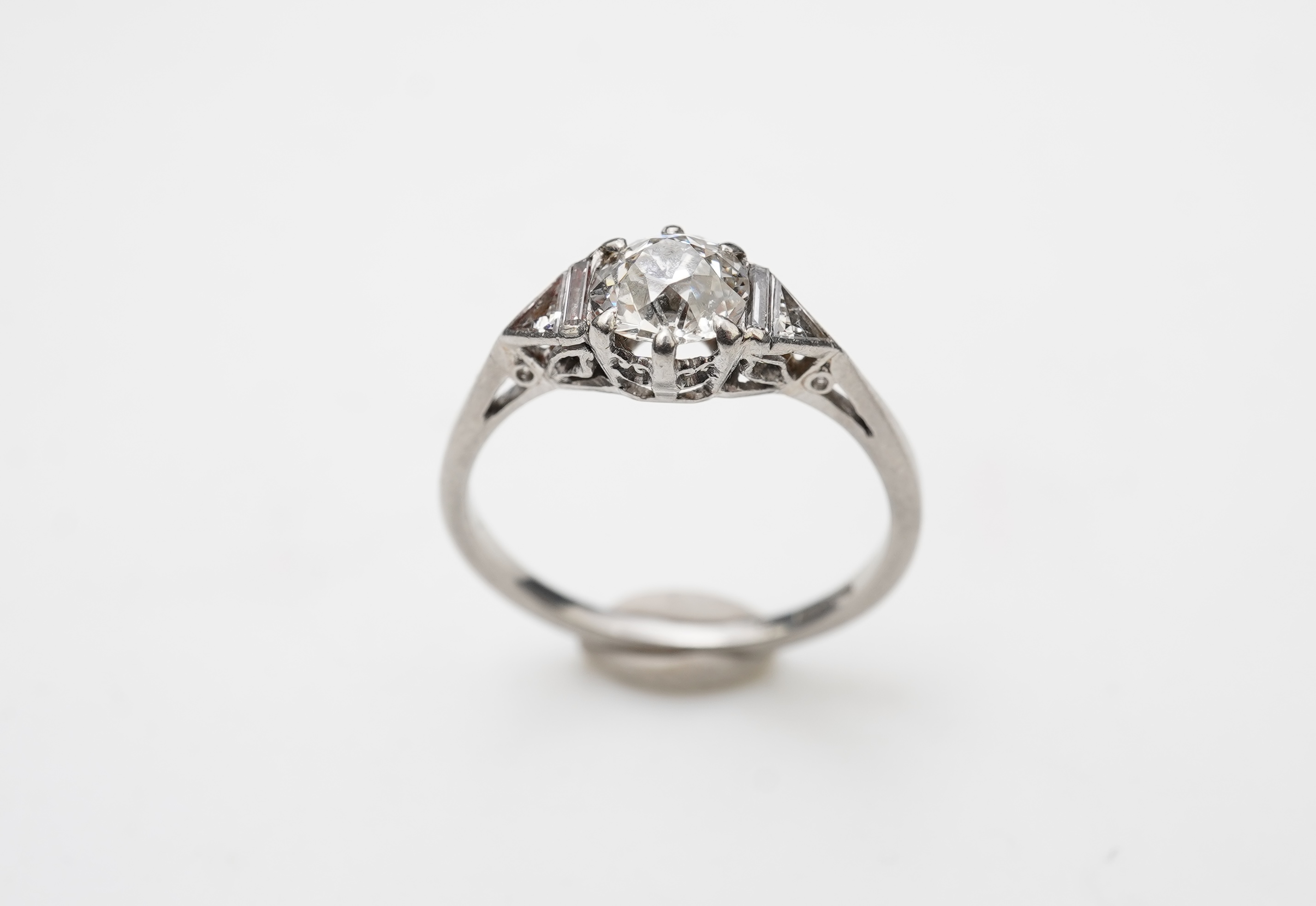 An Art Deco diamond ring, circa 1930, claw-set with a circular-cut diamond weighing approximately 0.60 carats, to shoulders set with baguette and triangular diamonds, mounted in platinum, size M, stamped PLATINUM, indistinctly numbered