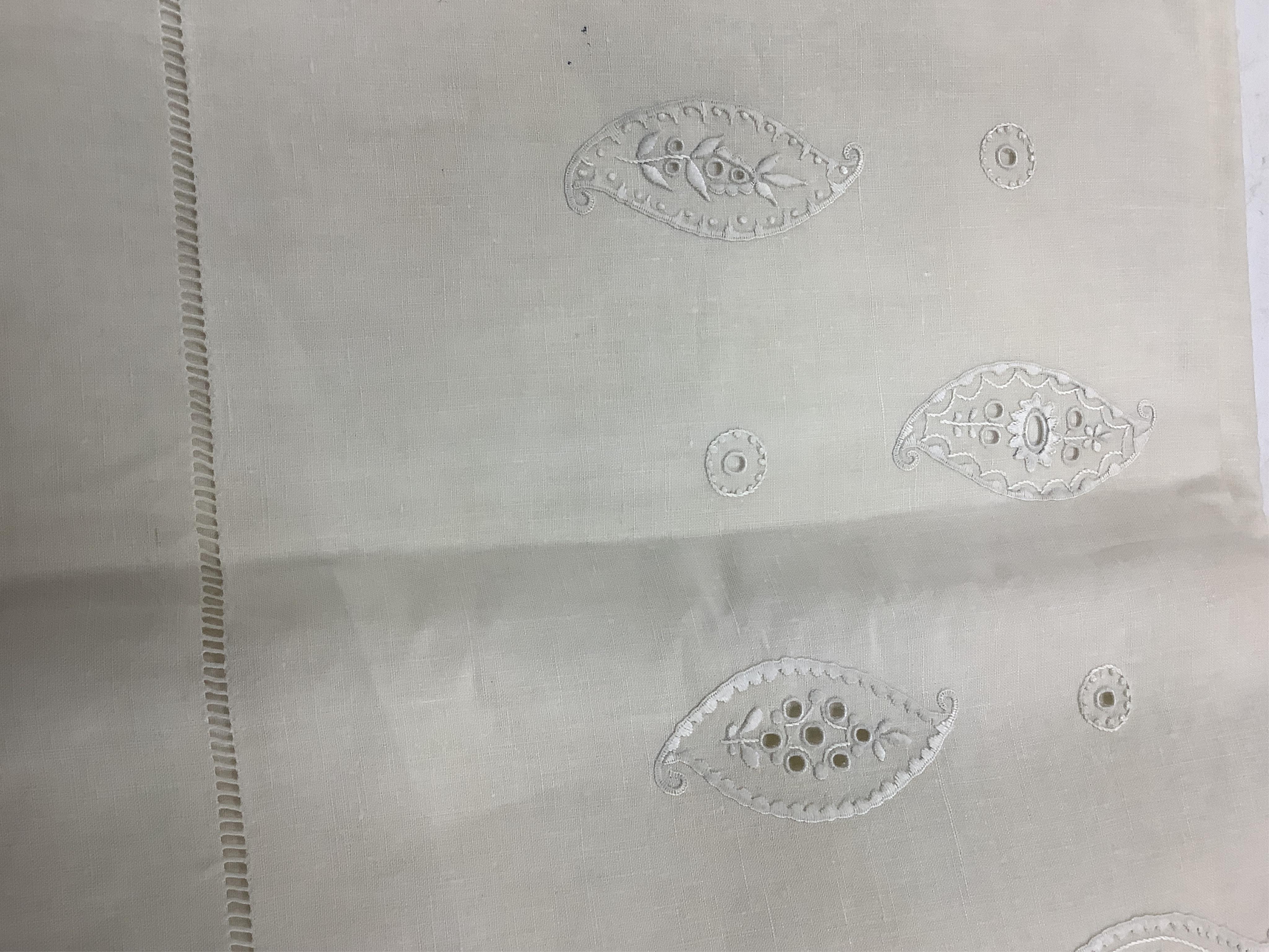 Lot 289 , Four 19th century French provincial linen top sheets. Two with deep heavily floral embroidered turn backs, another with tear drops embroidered on the turn back, the other a narrower sheet with a single embroidered monogr