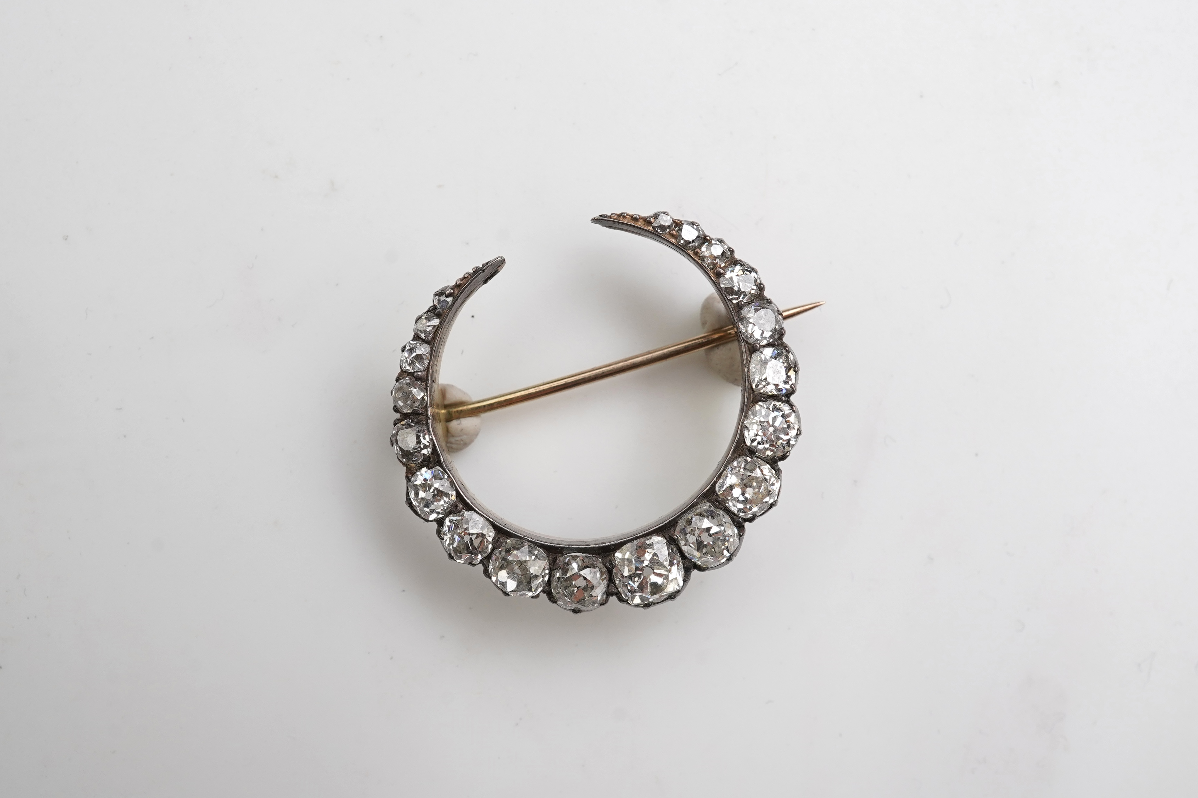 A Victorian diamond brooch, late 19th century designed as a crescent moon, set with cushion-shaped diamonds totalling approximately 2.50 carats, mounted in silver and gold, length approximately 3cm, fitted case stamped Carrington & Co
