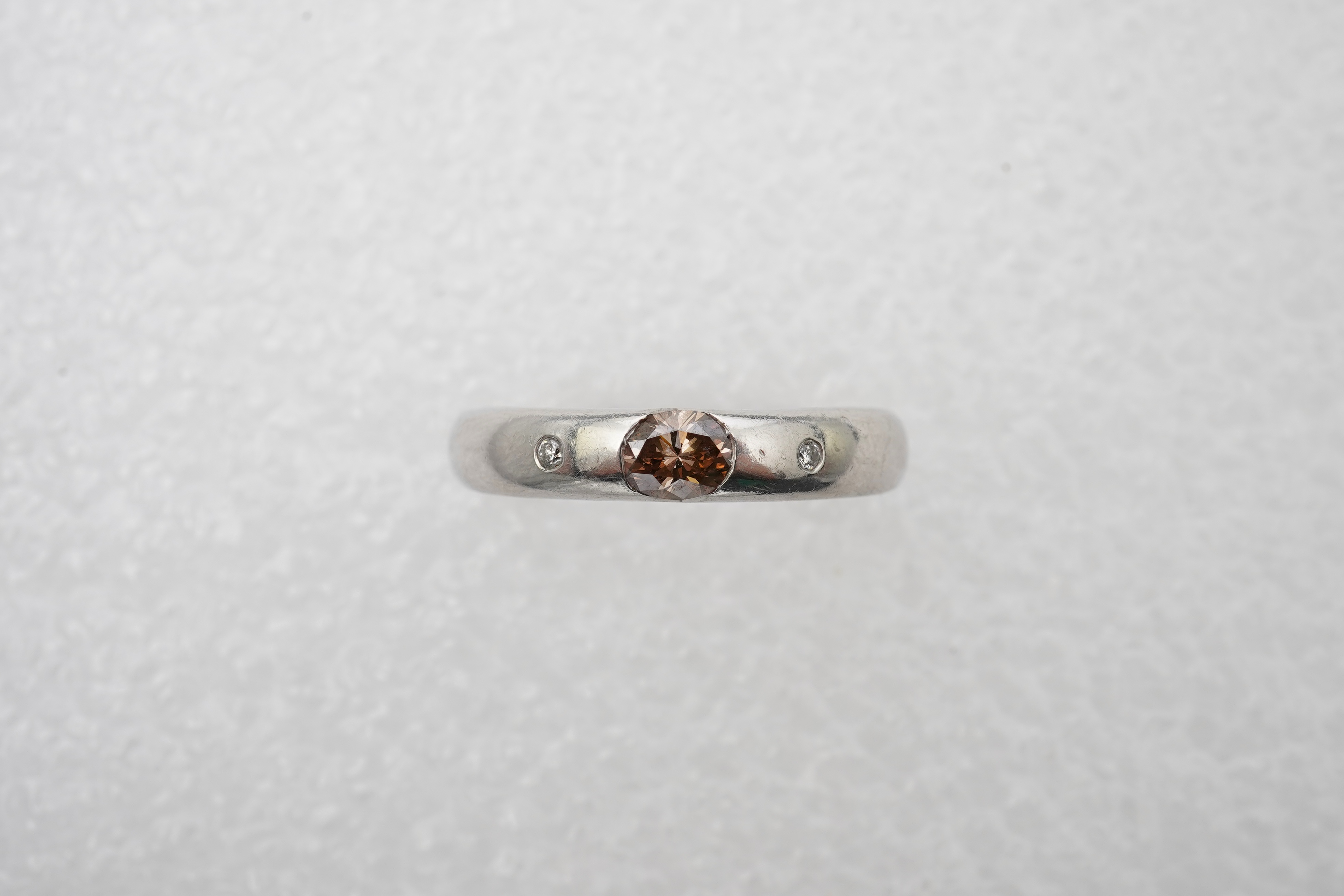 A brown diamond ring, rub over-set with an oval brown diamond weighing approximately 0.45 carats, to a heavy platinum band set with brilliant-cut diamonds to each shoulder, totalling approximately 0.06 carats, size X, British hallmarks, gross weight approximately 17.5 grams