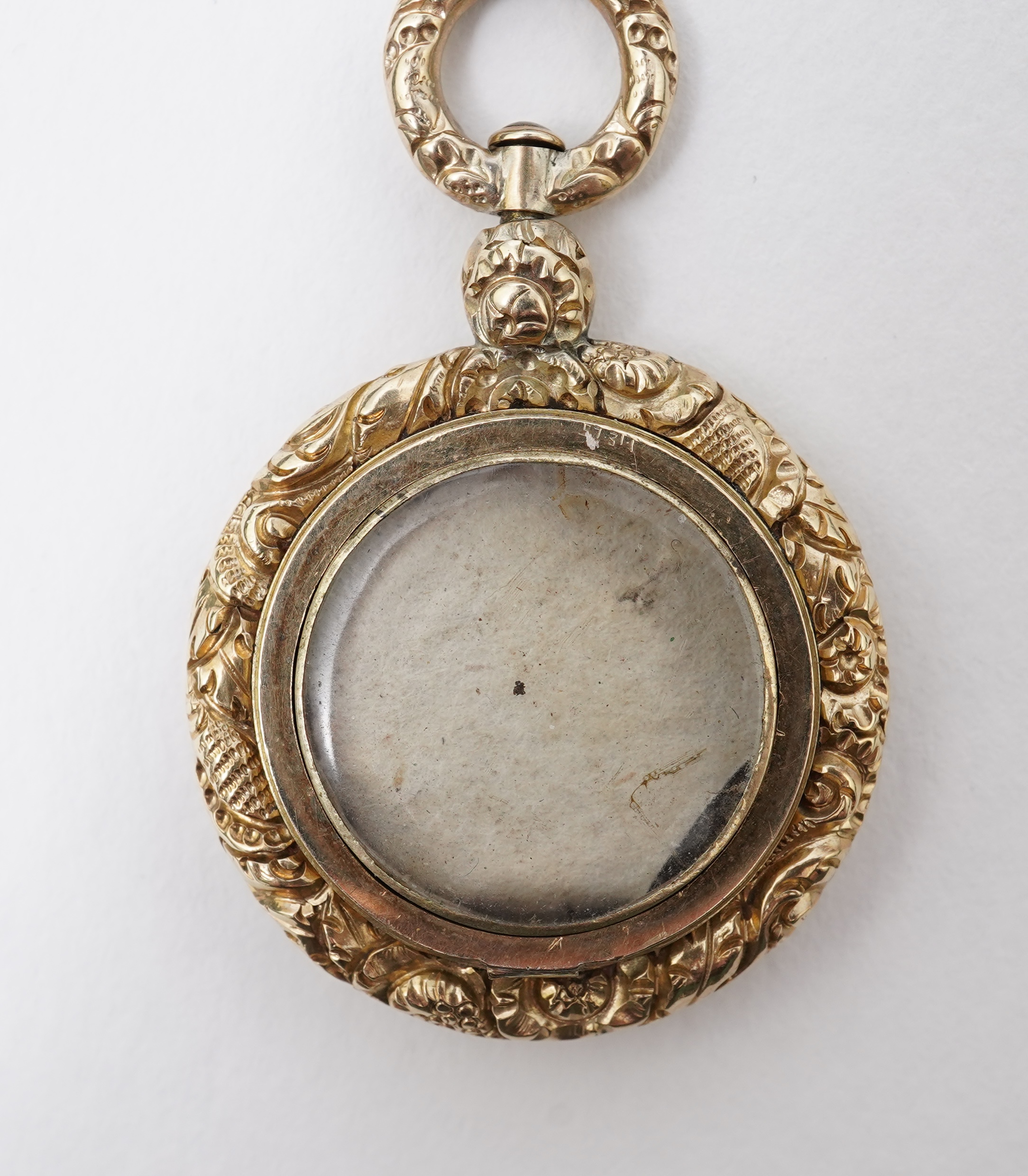 A Victorian gold locket pendant, mid 19th century, of circular outline, centring on a panel of engine turned engraving, to a border and pendant hoop carved with floral decoration, the reverse with a glazed panel, mounted in gold, length 4.1cm, gross weight approximately 9 grams