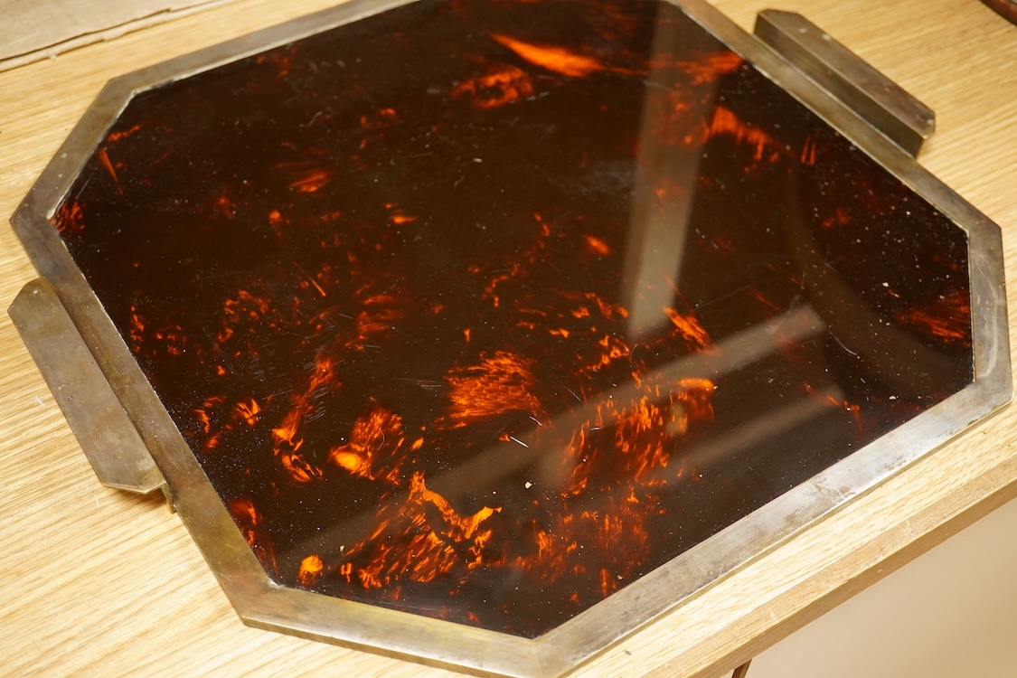 An Art Deco style silver plated two handled tray with faux tortoiseshell interior, 42cm