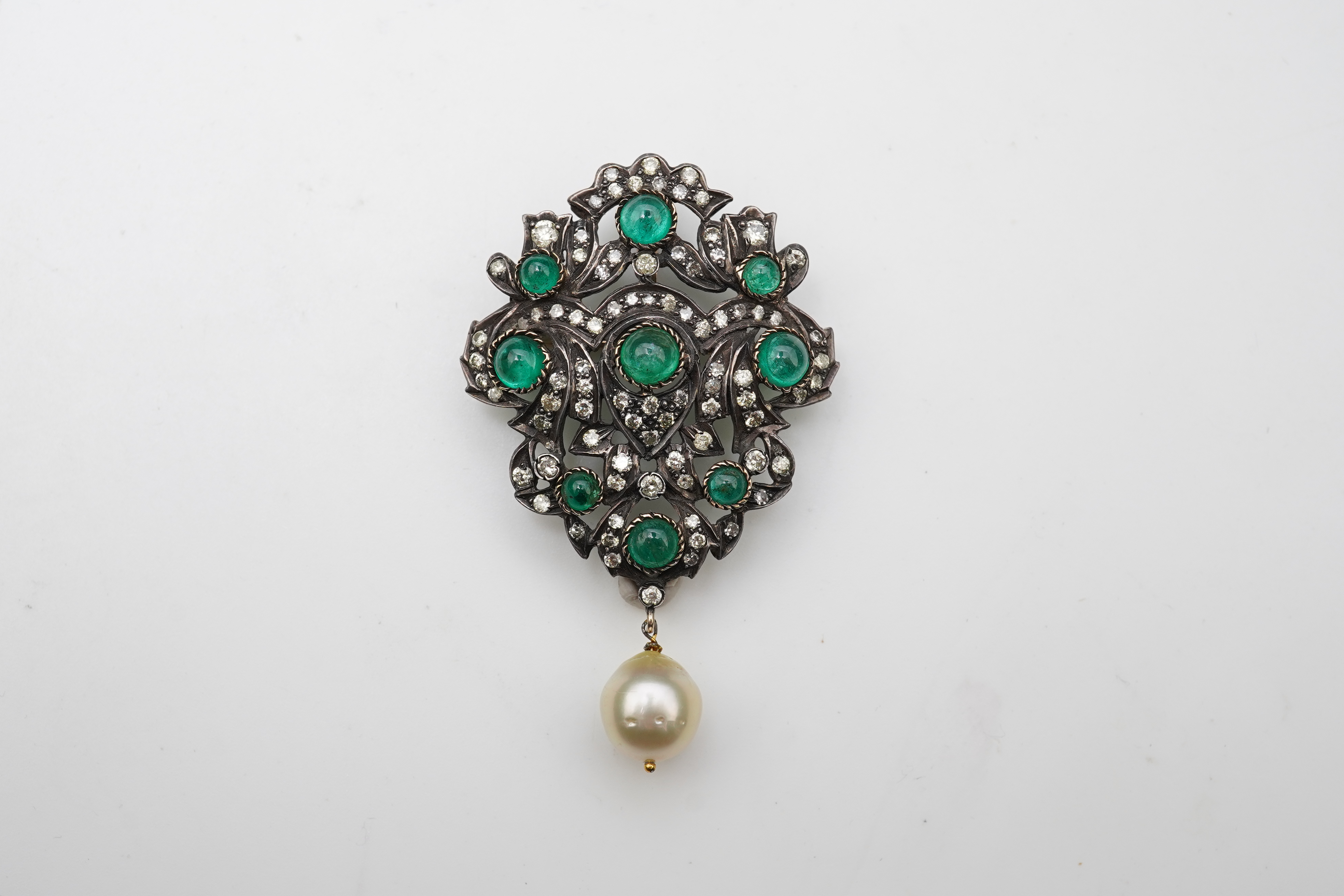 An emerald, cultured pearl and diamond pendant/brooch, designed as a panel of foliate scrollwork, set with cabochon emeralds and brilliant-cut diamonds, suspending a cultured pearl drop, mounted in silver, length 5.1cm