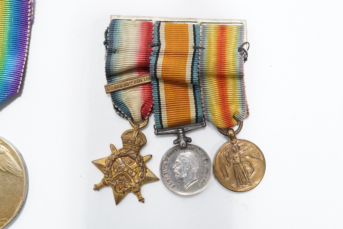 Four First World War medal groups awarded to; a trio to 9821. PTE. A. Waddup. 1/RL. BERKS. REGT., with a clasp for 5th Aug. - 22nd Nov. 1914, together with the miniature set,