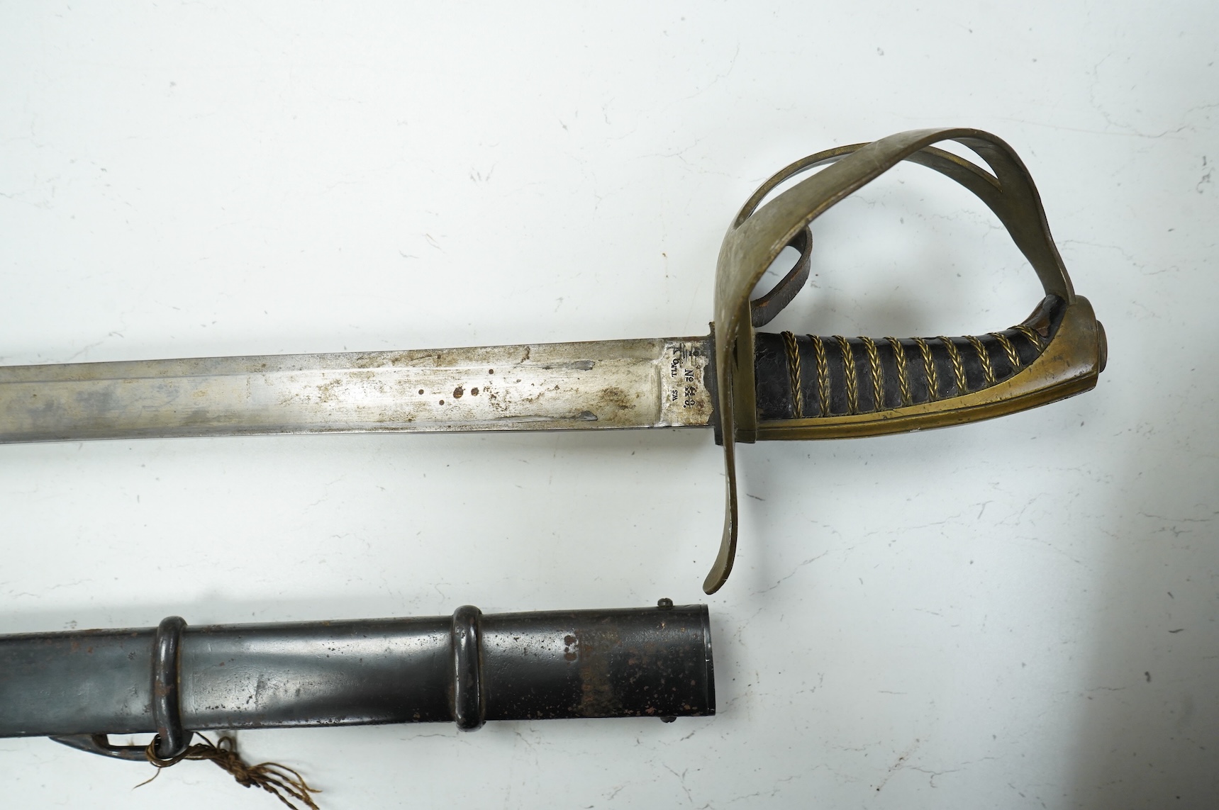A 19th century Swedish cavalry trooper’s sword, regulation brass guard with pierced opening brass wire bound grip blade struck with military markings, in its black iron scabbard