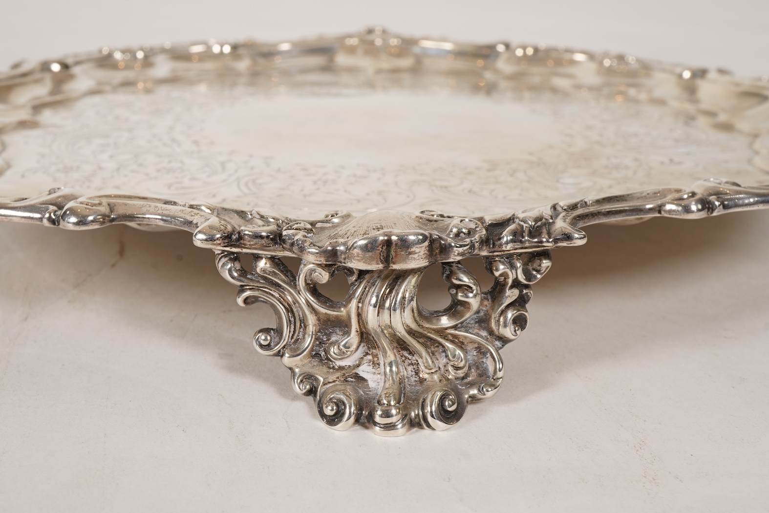 An early Victorian silver salver, by Paul Storr, of shaped circular form, with shell and scroll border and engraved foliate scroll decoration, on four pierced scroll feet, the base with contemporary engraved inscription 'A Memorial Bequeathed To Mary Calquhoun By Her Beloved Uncle James Dalziel Esquire M.D. R.N. MDCCCXXXVII', London, 1837, diameter 33.5cm, 37.8oz.