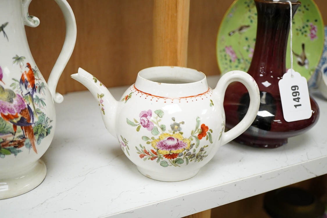 A Derby fantastic birds painted coffee pot, c.1760-65, 24cm high, a Bow porcelain teapot and similar coffee can, c.1770