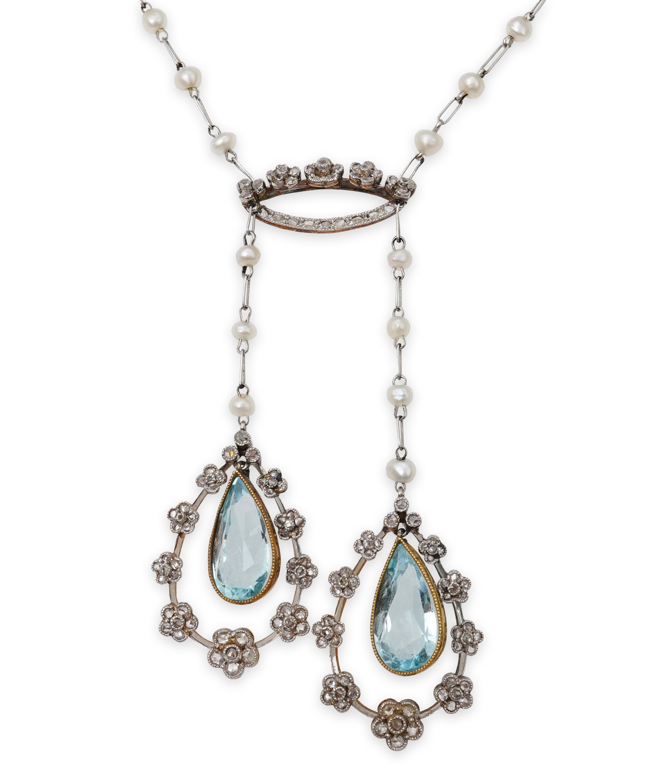 Lot 735 , Retailed by Carrington & Co., a Belle Epoque aquamarine, seed pearl and diamond necklace, early 20th century