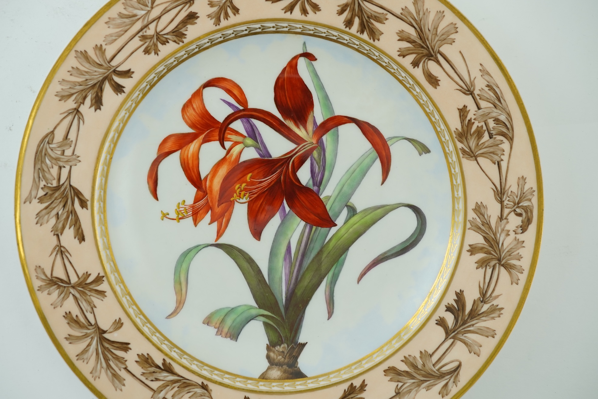 A KPM Berlin Aztec lily botanical specimen plate, c.1806-9, finely painted with a titled botanical study ‘Amaryllis formosissima Mexique’, after a design by the French botanist Étienne Pierre Ventenat (1757-1808), on a pale blue washed ground, the border with brown camaieu vine wreath on a pale caramel ground, underglaze blue sceptre mark, grey enamel line date code and brown enamel decorator’s mark +, 24cm diameter