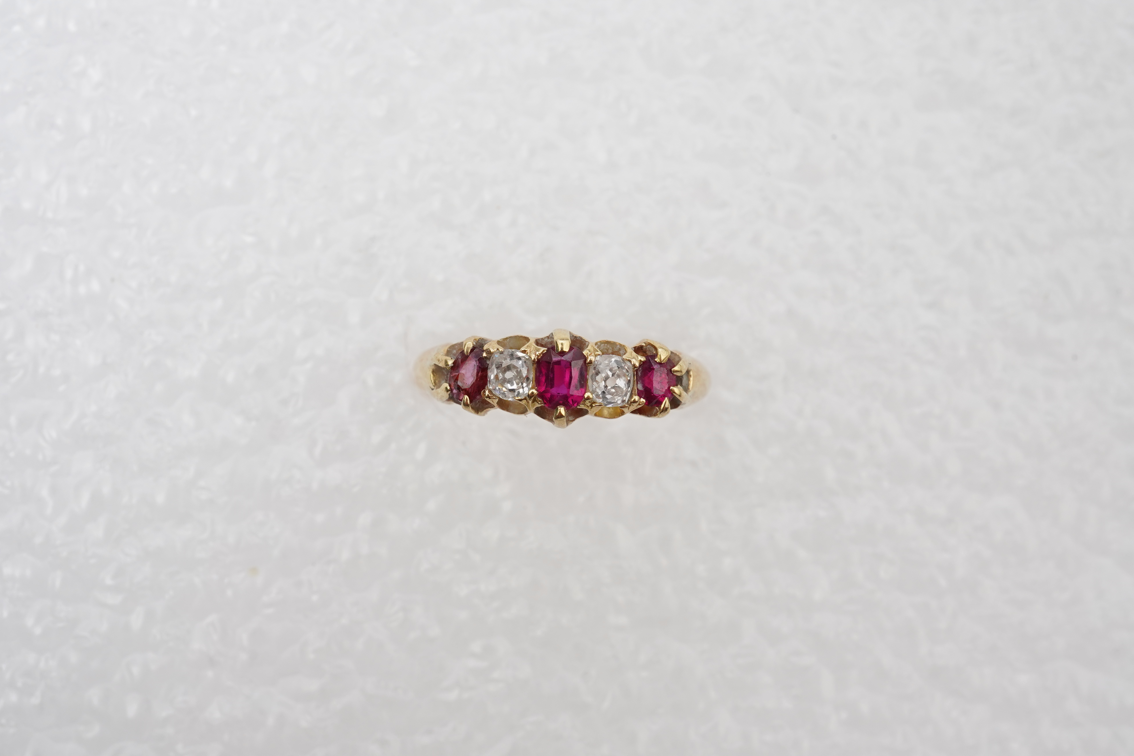 A ruby and diamond five-stone ring, circa 1900, set with an alternating sequence of three oval rubies and two cushion-shaped diamonds totalling approximately 0.20 carats, mounted in gold, size N1/2, stamped 18CT, gross weight approximately 2.5 grams