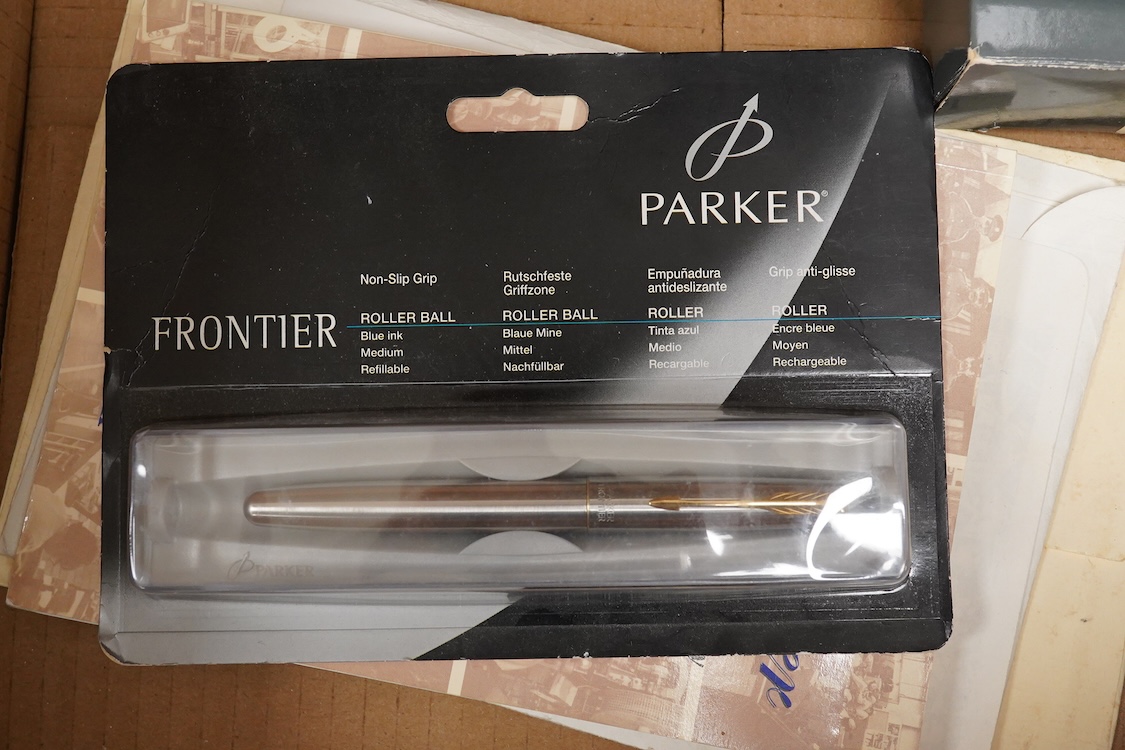 Lot 2148 , A Parker Duofold centennial fountain pen with matching ballpens in blue marble along with other Parker pens and paperwork relating to the Parker Pen Company