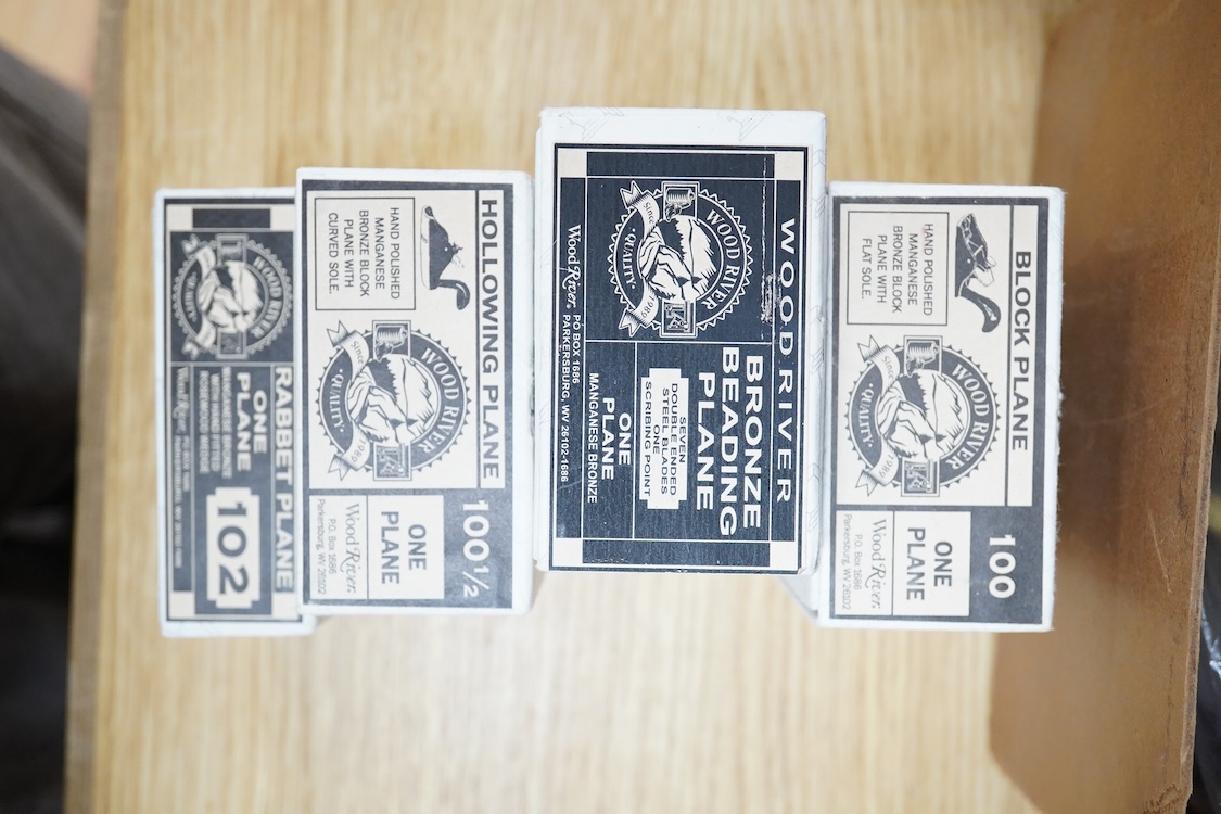 Lot 2310 , Seven planes by Veritas, Wood River, etc. including a boxed Veritas small scraping plane, four Wood River planes including a block plane, a beading plane, etc. A Harris Tools, brass finger plane, and a set of three minia