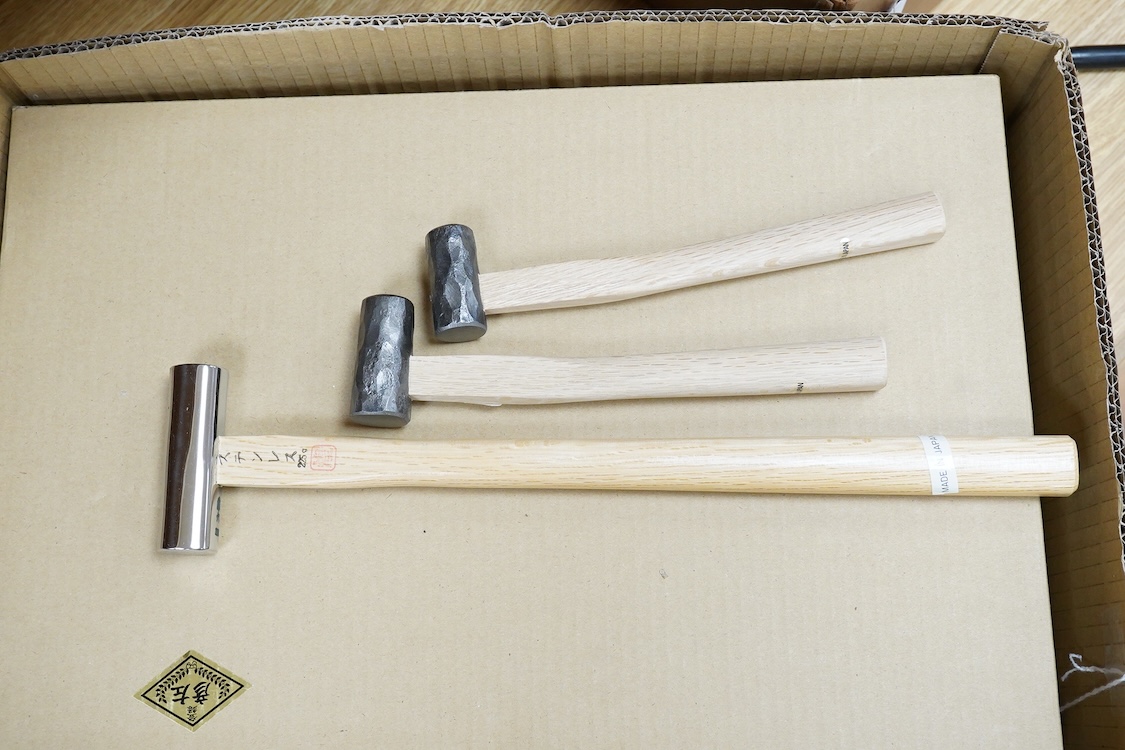 Lot 2309 , Two wood cased Japanese woodworking chisel sets, a timber framing set of five chisels and a 10 piece set of smaller chisels, both in fitted boxes, together with three small Japanese hammers
