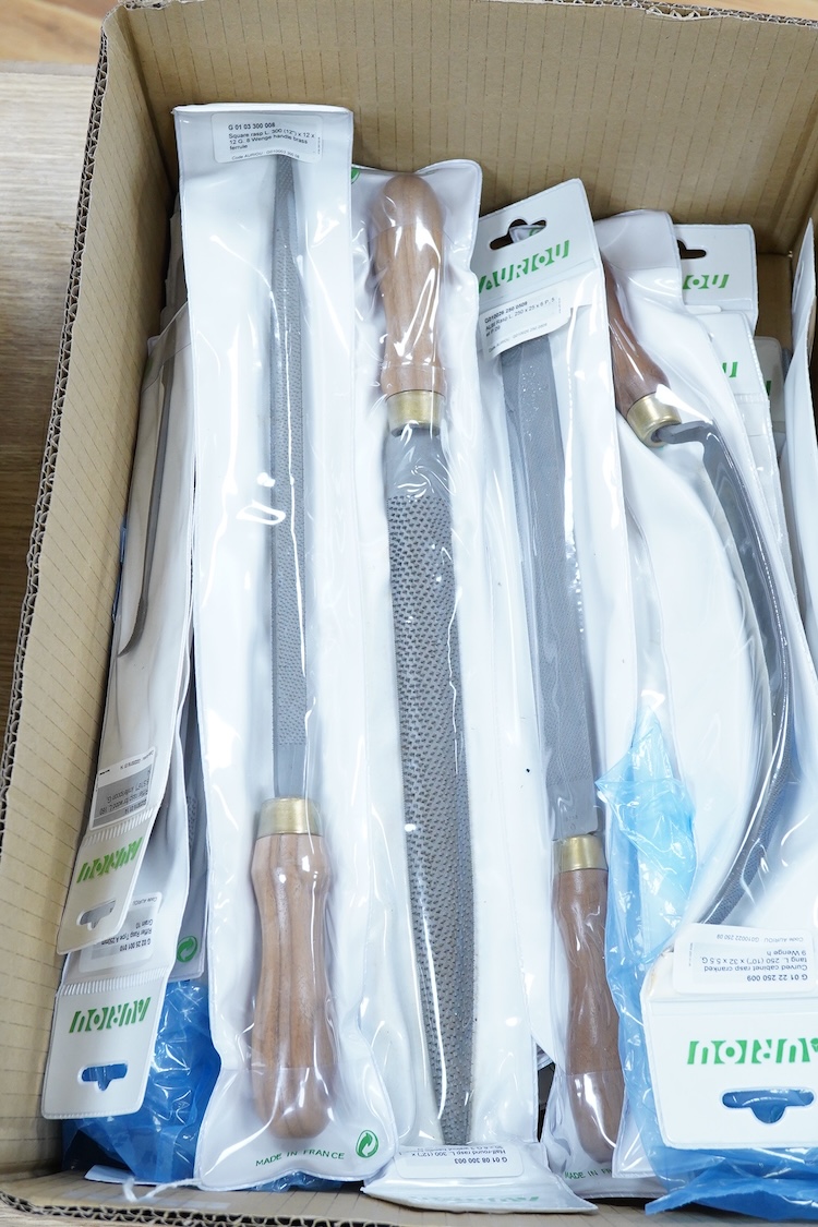 Thirty-three woodworking timber rasps by Auriou, including riffler rasps, taper rasps, square rasps, curved cabinet rasps, etc., all new in the original packets