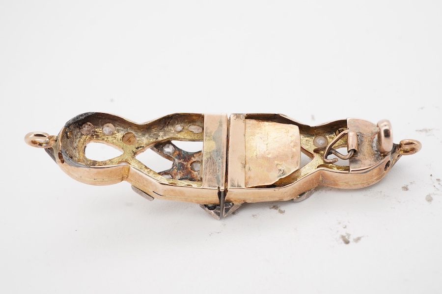 A diamond and half pearl necklace clasp, in gold and silver, length 5cm, pearls untested, gross weight approximately 9 grams
