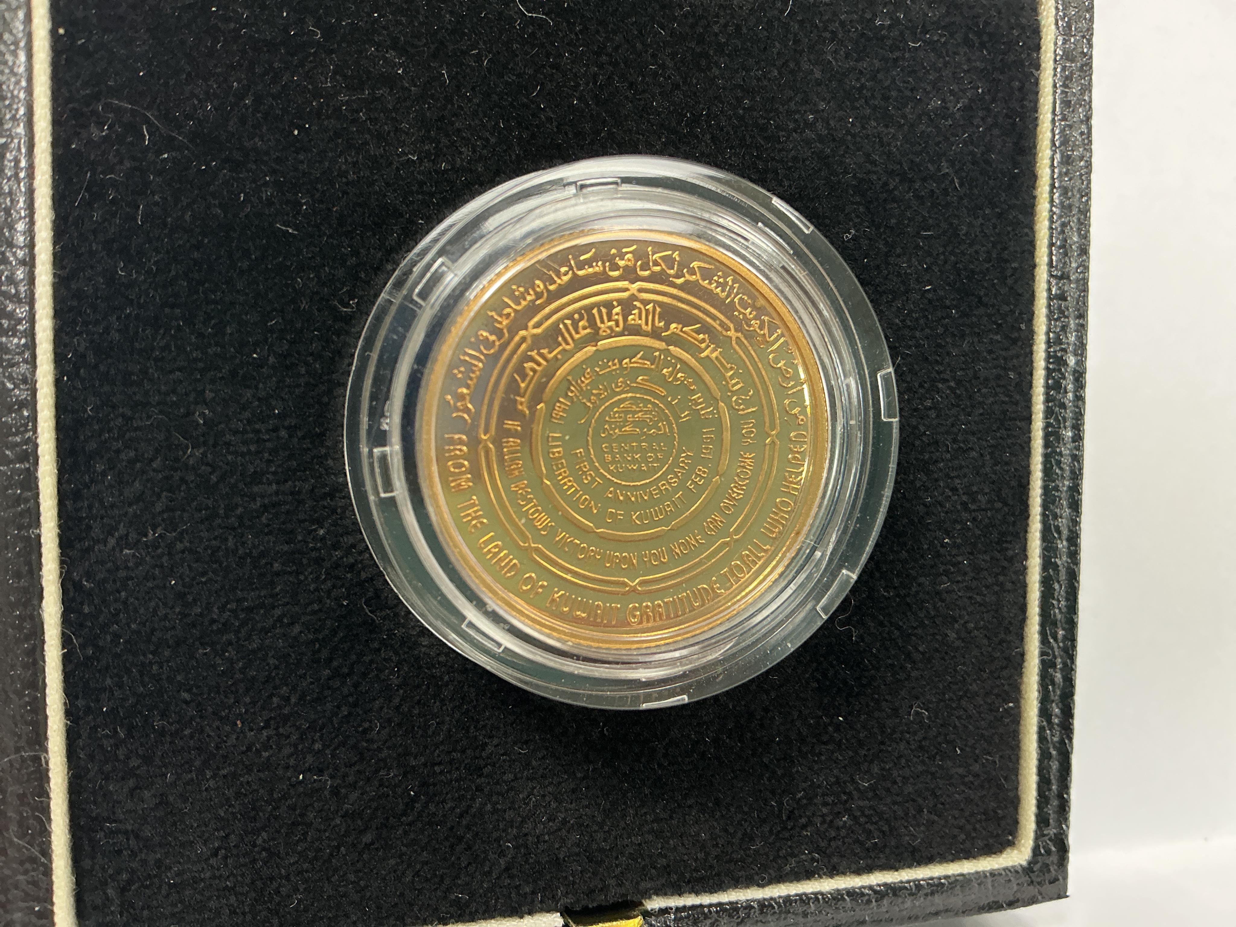 Lot 2098 , Gold coins, First Anniversary Liberation of Kuwait February 1991, commemorative gold 50 dinars, 16.96g, in case of issue with certificate