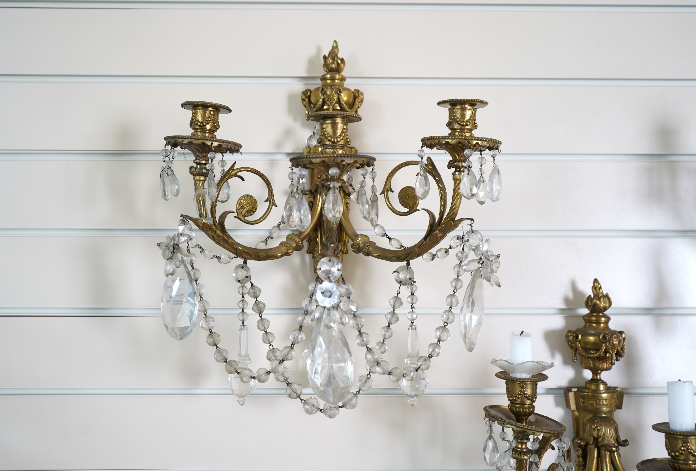 A set of four Louis XVI style ormolu and crystal wall sconces, the central fluted shaft surmounted by a flaming vase with ram’s masks, issuing three acanthus scroll branches suspended with faceted and pear-shaped crystal drops, approximately 45cm high overall