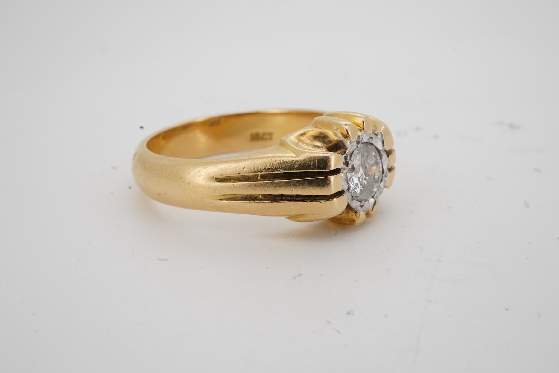 Lot 2923 , A diamond signet ring, claw-set with a brilliant-cut diamond weighing approximately 0.50 carats, mounted in gold, size Q, stamped 18CT, gross weight approximately 8.5 grams