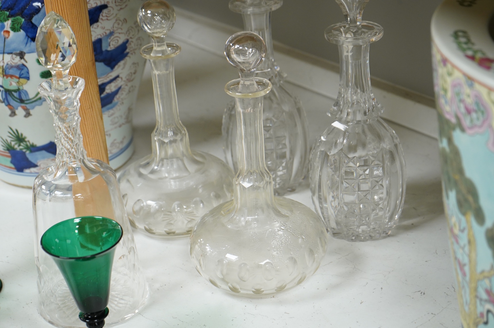 Lot 1473 , A set of four 19th century Bristol green glasses, an early 19th century spirit decanter and other Victorian decanters