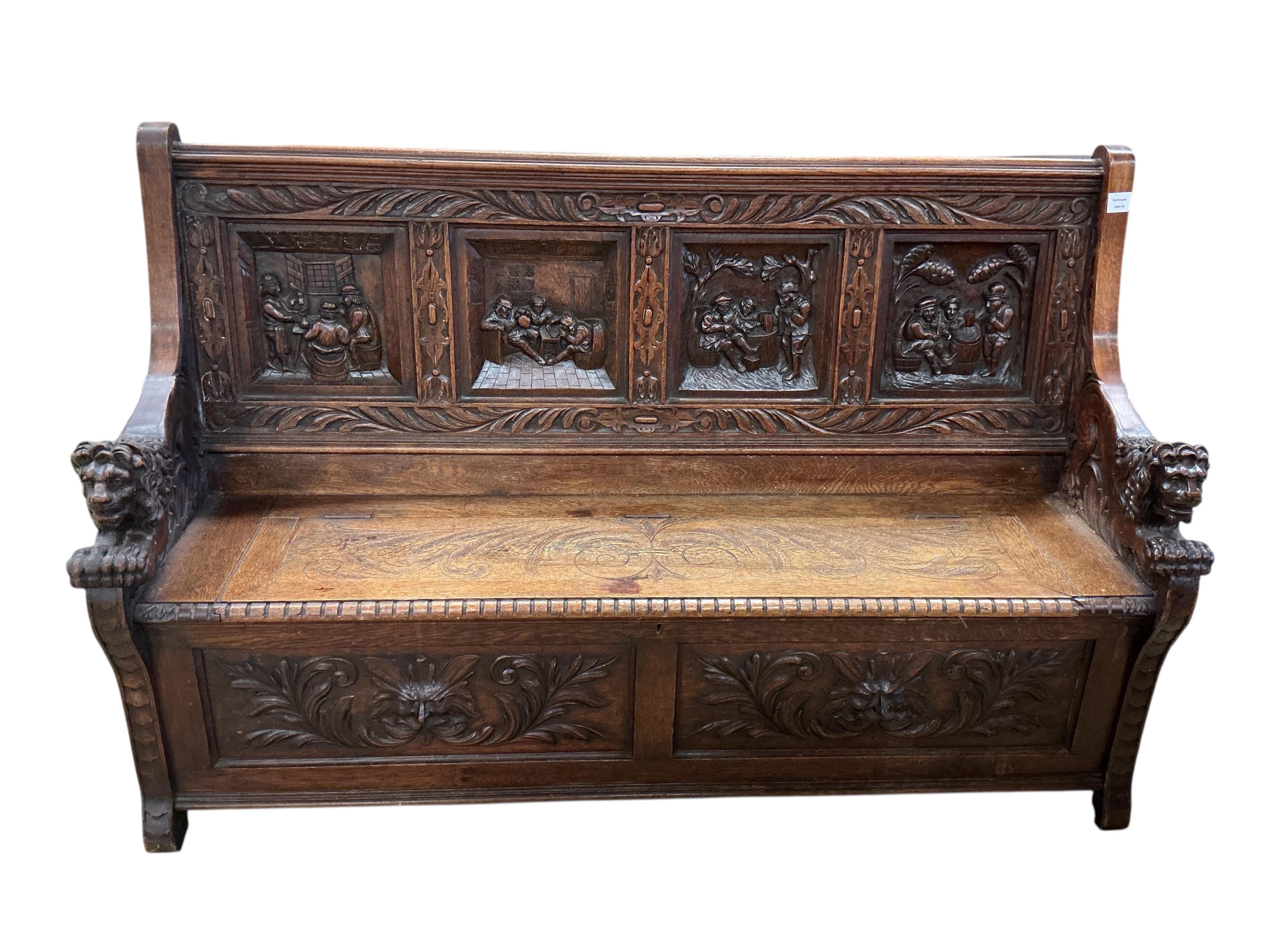 Lot 10 , A late 19th century Flemish carved oak settle with hinged box seat, width 160cm, depth 42cm, height 106cm