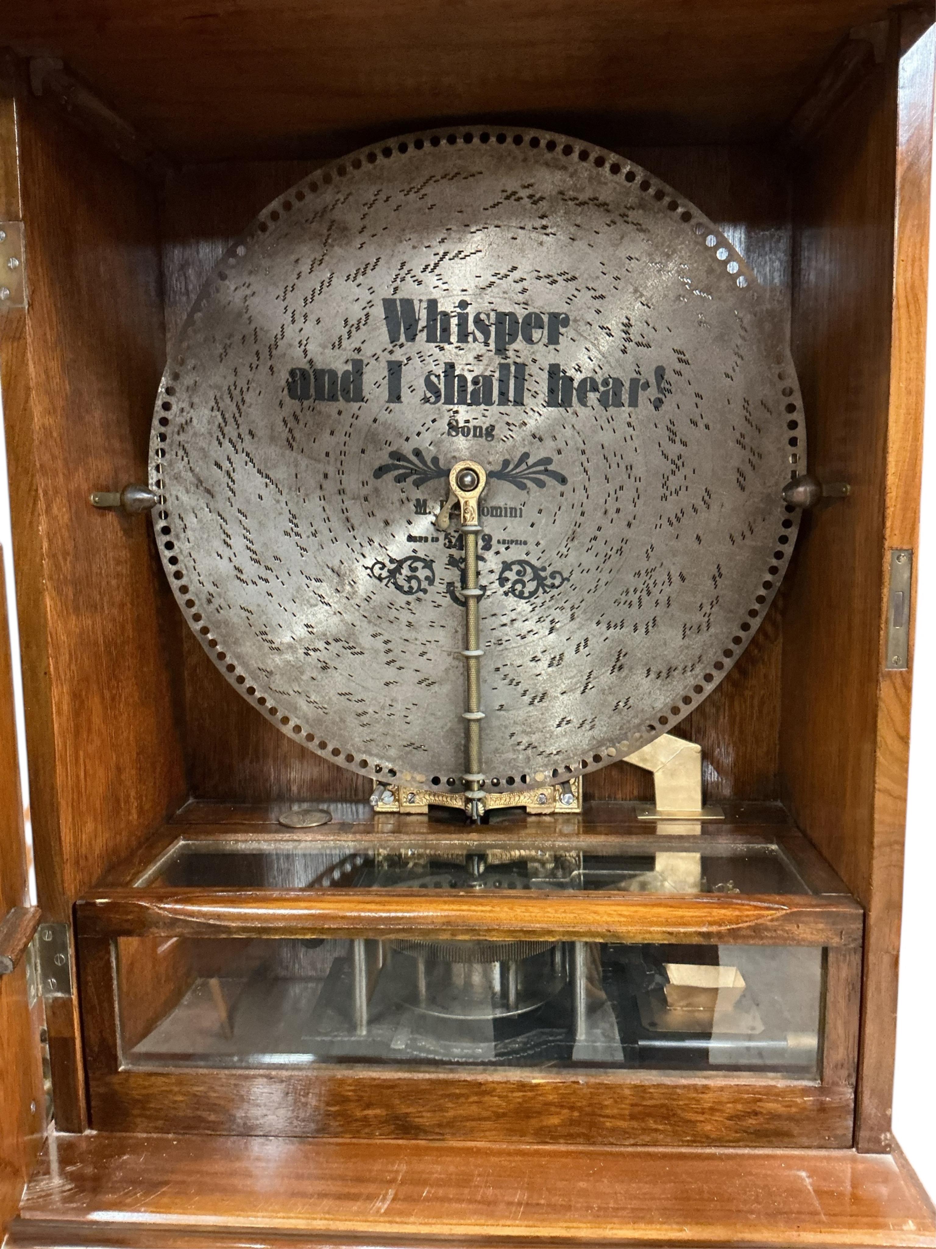 A floor standing coin-operated walnut polyphon disc player with nine 50cm diameter discs, the base containing storage compartments for the discs, coin slots on both sides with guilt finished surrounds next to applied labels reading; ‘Drop a Penny in the slot. Polyphon Supply Co. Ltd. 84 Oxford Street London, W.’, overall height 207cm, width 68cm, depth 40cm, together with winding handle, and a quantity of old pennies required for operation