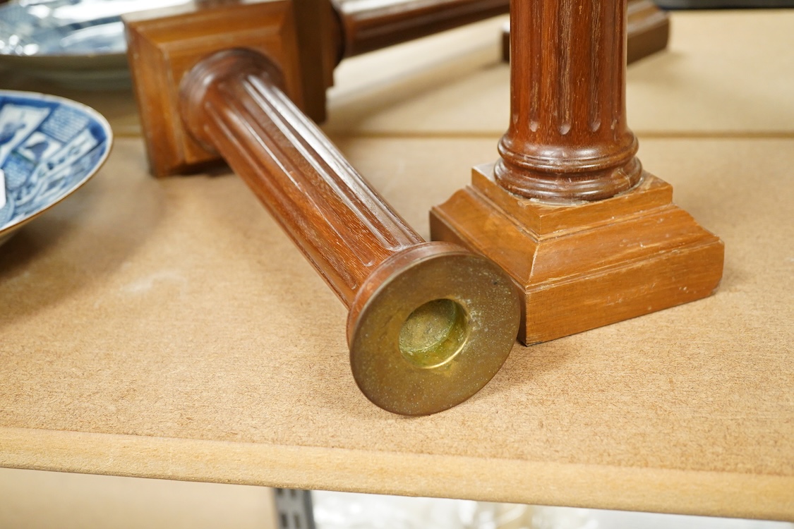 These have been used and some candle-wax residues remain; detachable brass sconces tarnished; no structural damage but wood surfaces are not pristine due to acceptable usage. Impressed mark Linley clear.