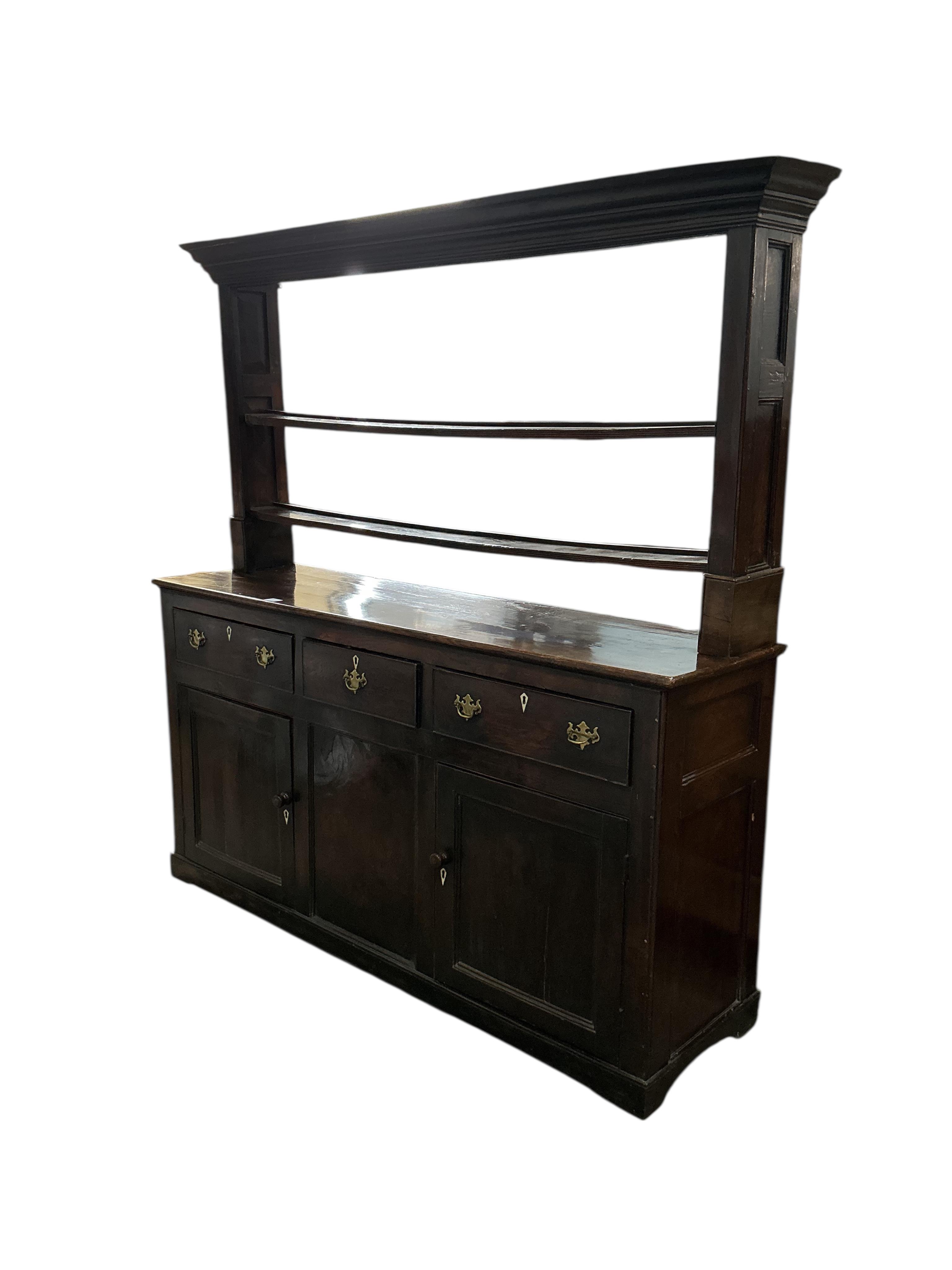 Lot 1003 , An 18th century oak dresser with open rack, (back boards wormed), width 170cm, depth 47cm, height 182cm