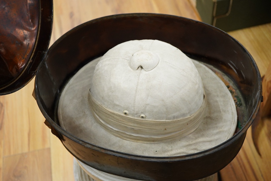 Lot 2395 , Two military interest pith helmets, in a tin box