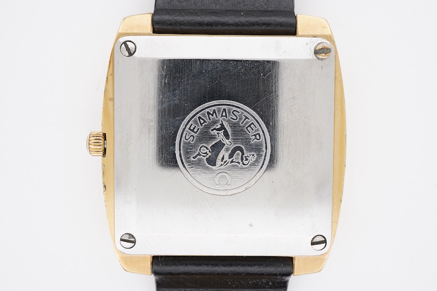 A gentleman's steel and gold plated Omega Seamaster automatic wrist watch, with baton numerals and date aperture, case diameter 38mm, on an associated leather strap, no box or papers.