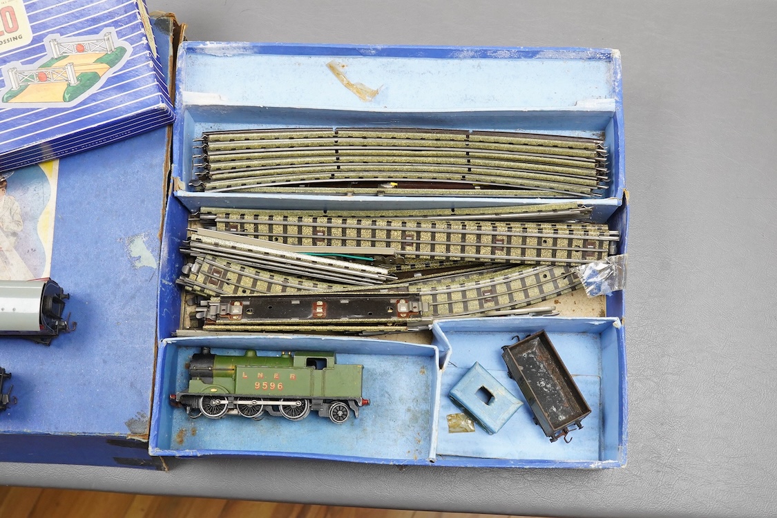 A small collection of Hornby Dublo railway for 3-rail running, including; an LNER class N2, 0-6-2T locomotive, 9596, in green livery, together with two bogie coaches, an open wagon, a D1 level crossing and a selection of track sections, contained within a box for an EDG7 Tank Goods Train set