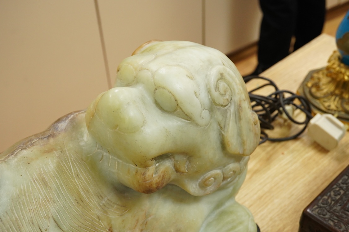 A large Chinese bowenite jade model of a lion dog, wood stand, 44cm
