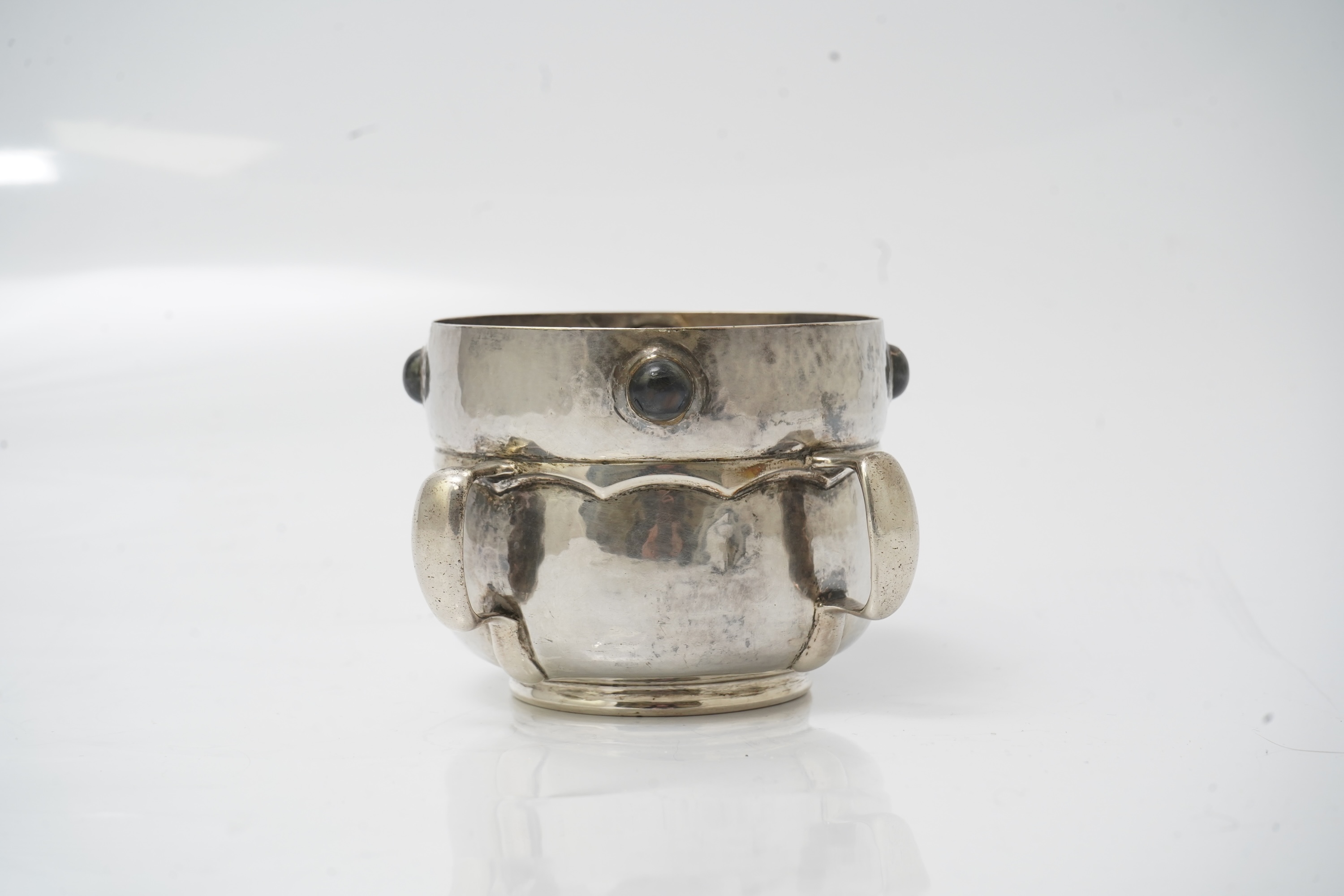A late Victorian Arts & Crafts Oliver Baker for Liberty & Co. Cymric cabochon mounted four handle vase, of planished design and set with four cabochon labradorite stones, Birmingham, 1900, height 76mm, gross weight 8.1oz.