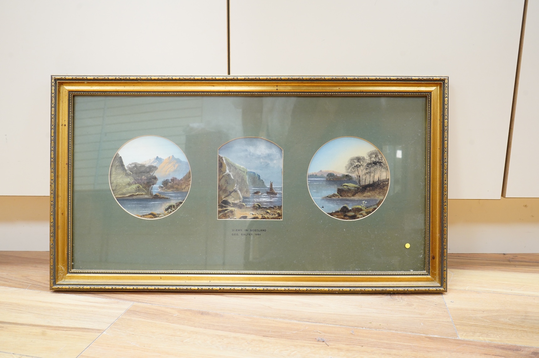 George Salter (late 19th. C), 'Views in Scotland', set of three oils, mounted and framed as one, inscribed to the mount, overall 30 x 60cm