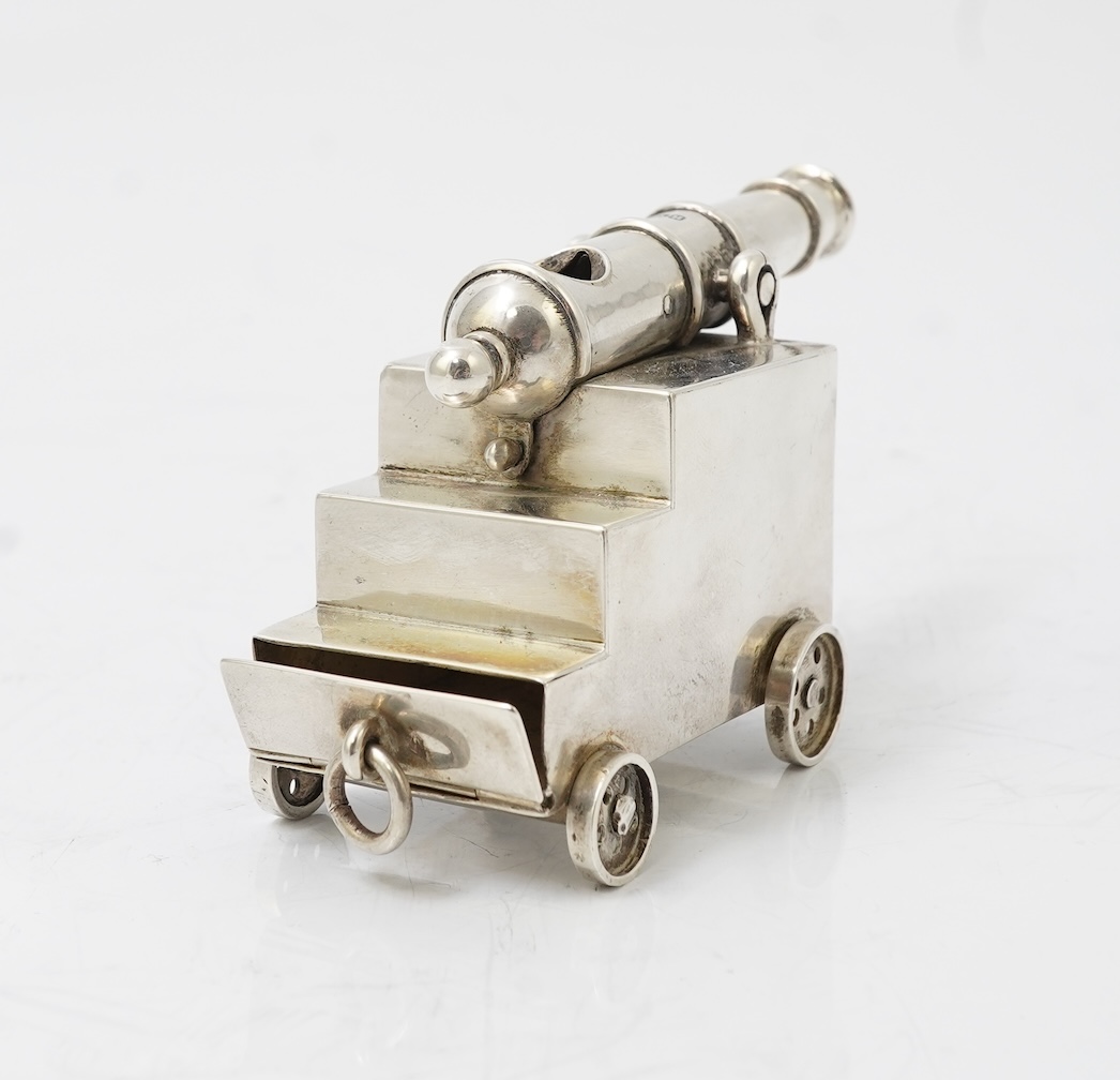 A late Victorian novelty silver cigar cutter, modelled as a cannon upon a stepped base, with four wheels and single fall front drawer, makers mark rubbed, possibly Hilliard & Thomasson, Birmingham, 1894, overall length 85mm, height 52mm.