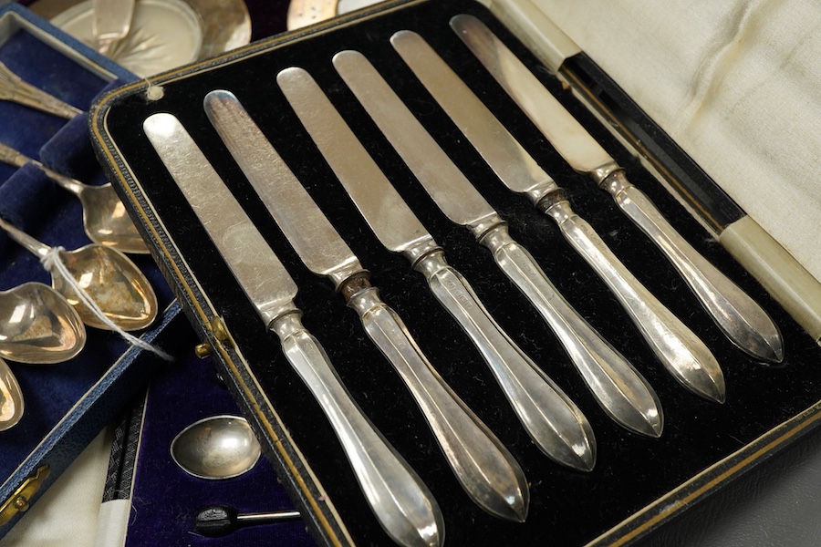A cased pair of Victorian silver butter dishes with matching knives and glass inserts, by Henry Stratford Ltd, Sheffield, 1887, diameter 11.5cm, together with a cased set of six later silver grapefruit spoons, a cased set of silver handled tea knives, two silver coffee spoons and a cased set of six plated bean end coffee spoons and seven other items of plated flatware.