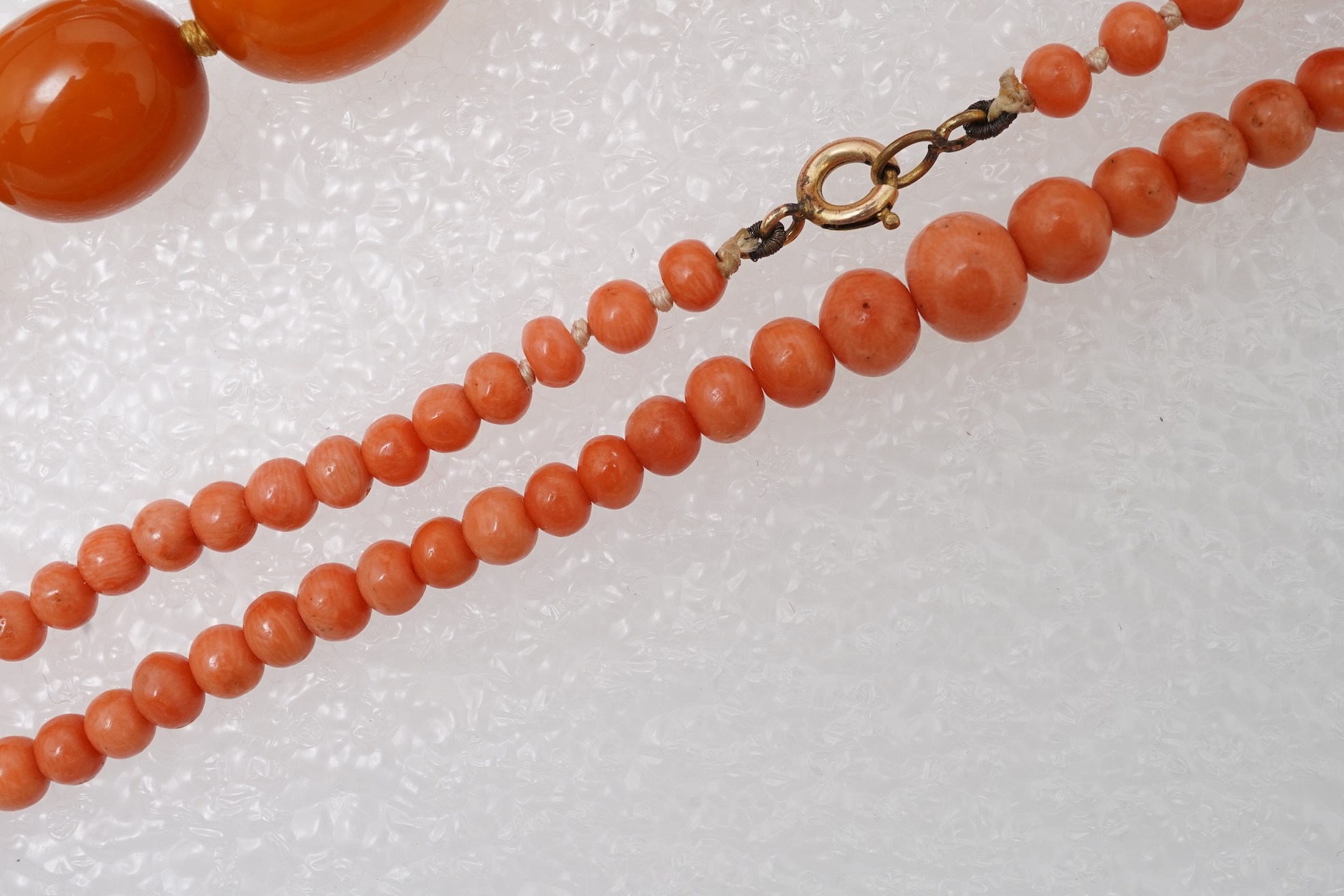 An amber necklace and a coral necklace, the amber necklace composed of graduated beads measuring approximately 0.9-1.6cm, length approximately 46cm; the coral necklace composed of beads measuring approximately 4.3-7.4mm, length approximately 42.5cm