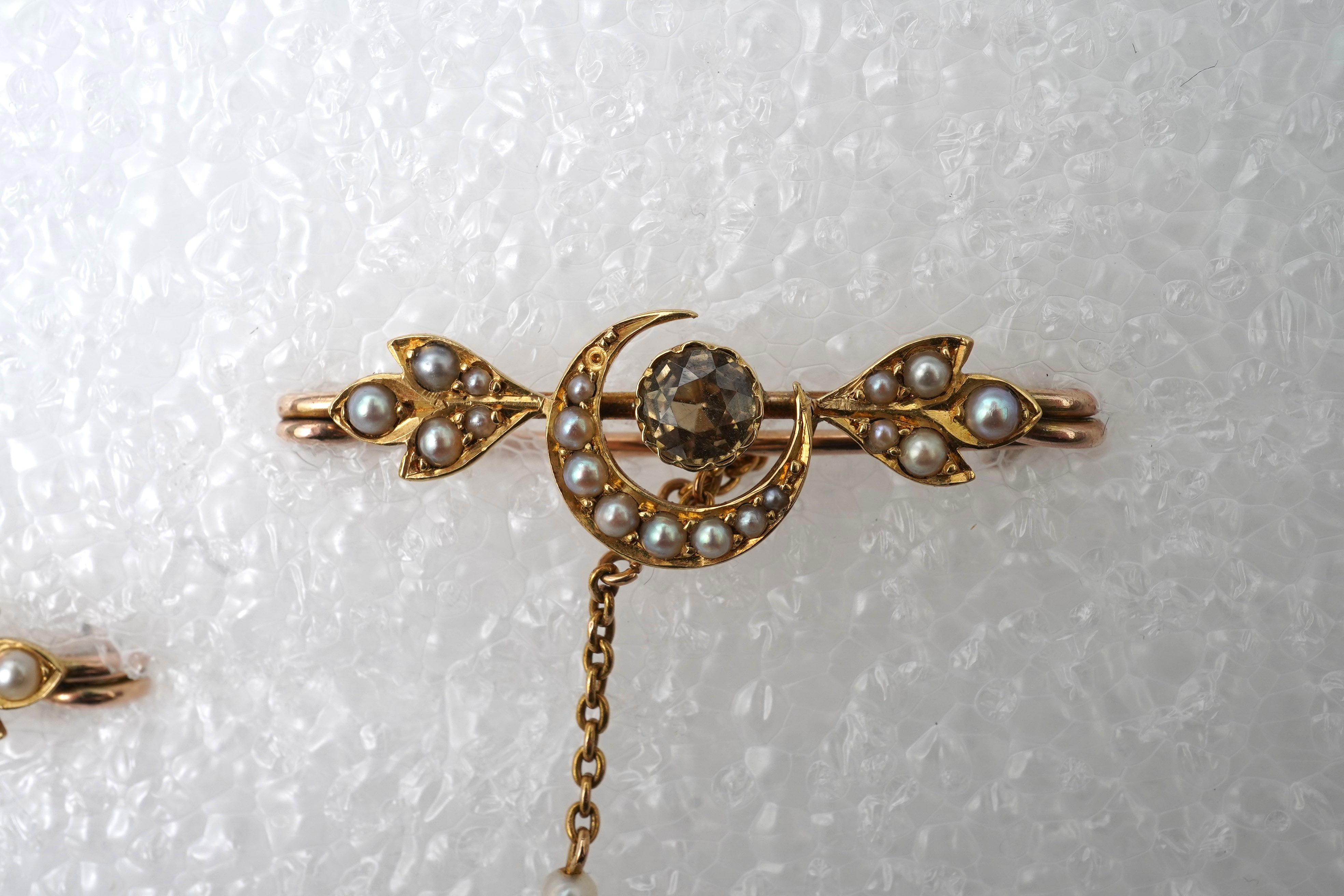 A, Edwardian zircon, garnet and seed pearl double brooch, early 20th century, each brooch designed as a crescent moon between foliate motifs, set with seed pearls, and a circular-cut garnet and yellow zircon respectively, connected by a chain threaded with seed pearls, mounted in gold, each brooch 3.8cm, chain 10cm, gross weight approximately 7.9 grams, original fitted case stamped JW Benson Ltd