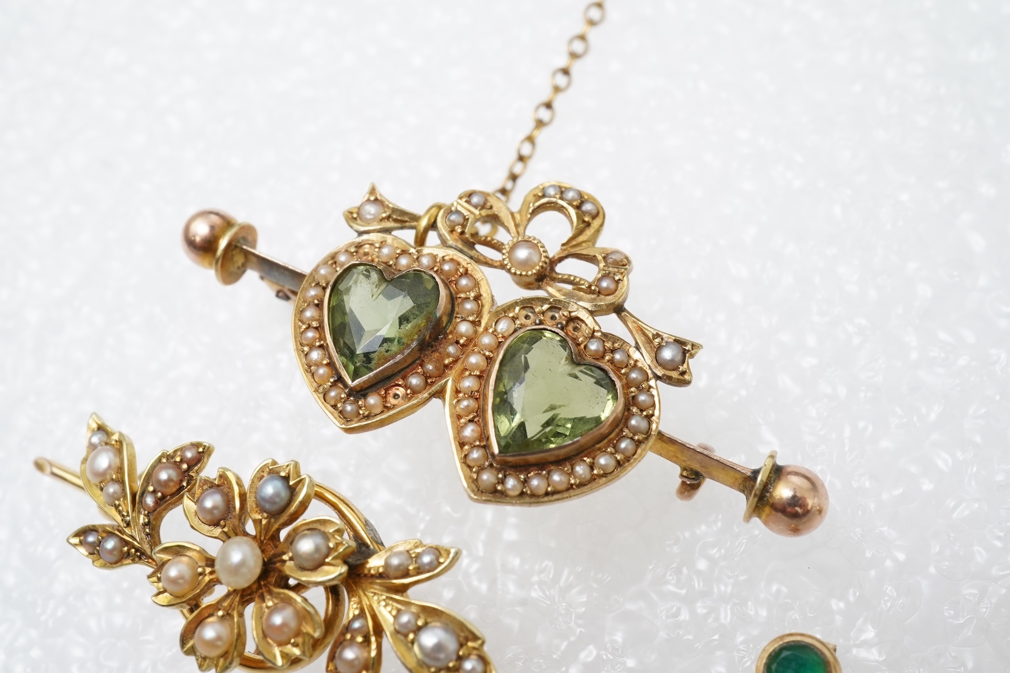 A collection of Edwardian jewels, early 20th century, comprising: a green paste and seed pearl brooch designed as two hearts topped with a ribbon bow, mounted in gold, length 4.4cm, gross weight approximately 5.5 grams, two seed pearls deficient; a floral seed pearl bar brooch, length 4.1cm, stamped 15CT, gross weight approximately 4.5 grams; a gold bangle of hinged design, set to the front with a circular-cut sapphire and two half pearls, inner circumference approximately 19cm, gross weight approximately 10 grams; a pair of chrysoprase stud earrings; and a single peridot and seed pearl drop earring