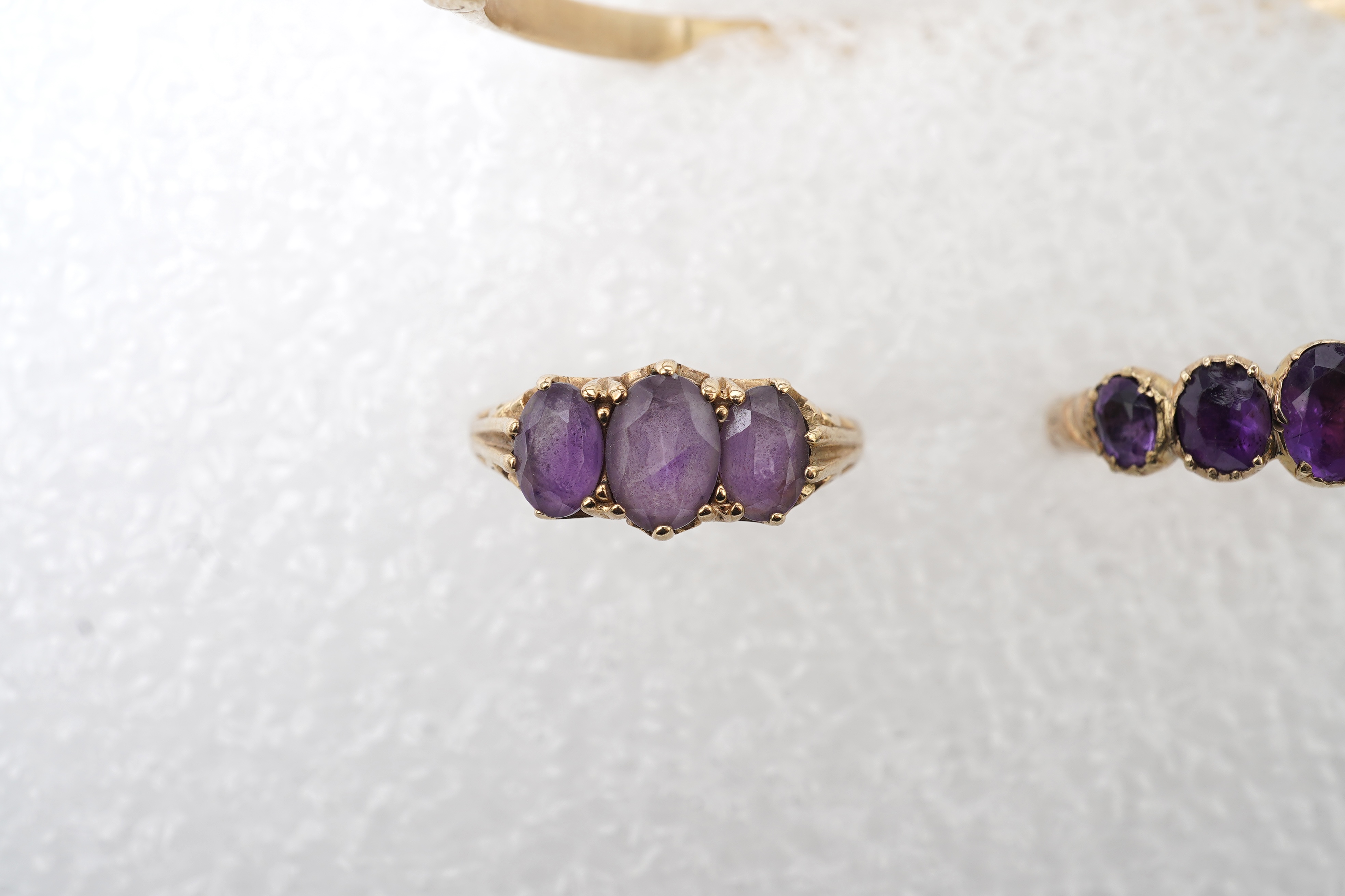 A collection of amethyst jewels, comprising: a hinged 9ct gold bangle set to the front with oval amethysts and brilliant-cut diamonds, decorated with scrolled designs, inner circumference 17cm, British hallmarks, gross weight approximately 11.5 grams; together with a 19th century five-stone amethyst ring, with closed settings and scrolled engraving to the shoulders, mounted in gold, size O1/2, gross weight approximately 2 grams; and a 9ct amethyst three-stone ring, size P, British hallmarks, gross weight 2.5 grams