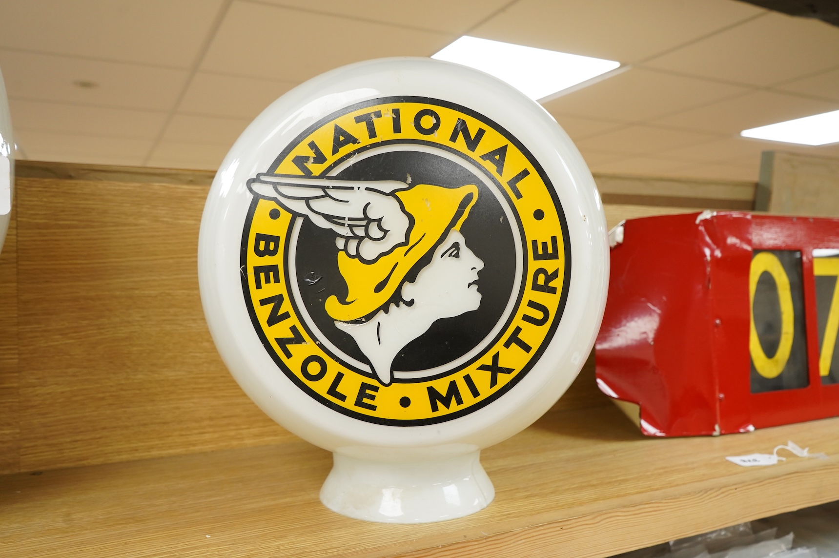 Lot 378 , A National Benzole Mixture triple sided opaque glass petrol pump globe, 43cm high, (base af)