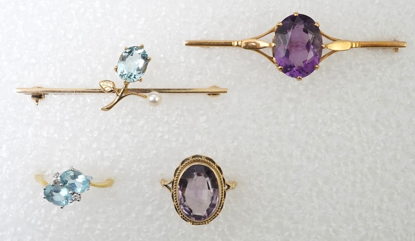 A collection of amethyst and aquamarine jewels, comprising: a bar brooch and ring, each set with an oval amethyst, brooch 5.4cm, ring size M, ring with British hallmarks for 9ct gold, combined gross weight approximately 9.5 grams; together with a bar brooch set with an oval aquamarine and a cultured pearl in 9ct gold, length 5.1cm, British hallmarks, gross weight 3.5 grams; and a ring, set with two oval aquamarines and two brilliant-cut diamonds, mounted in 18ct gold, size N, British hallmarks, gross weight approximately 3.5 grams