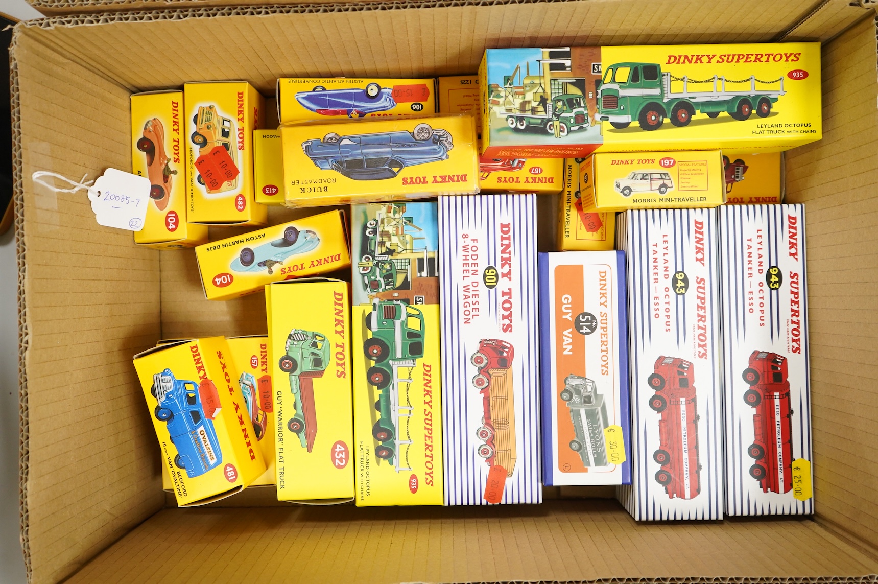 Twenty-two boxed Atlas Dinky Toys, including cars and commercial vehicles, Leyland tankers, a Foden wagon, sports cars, etc.