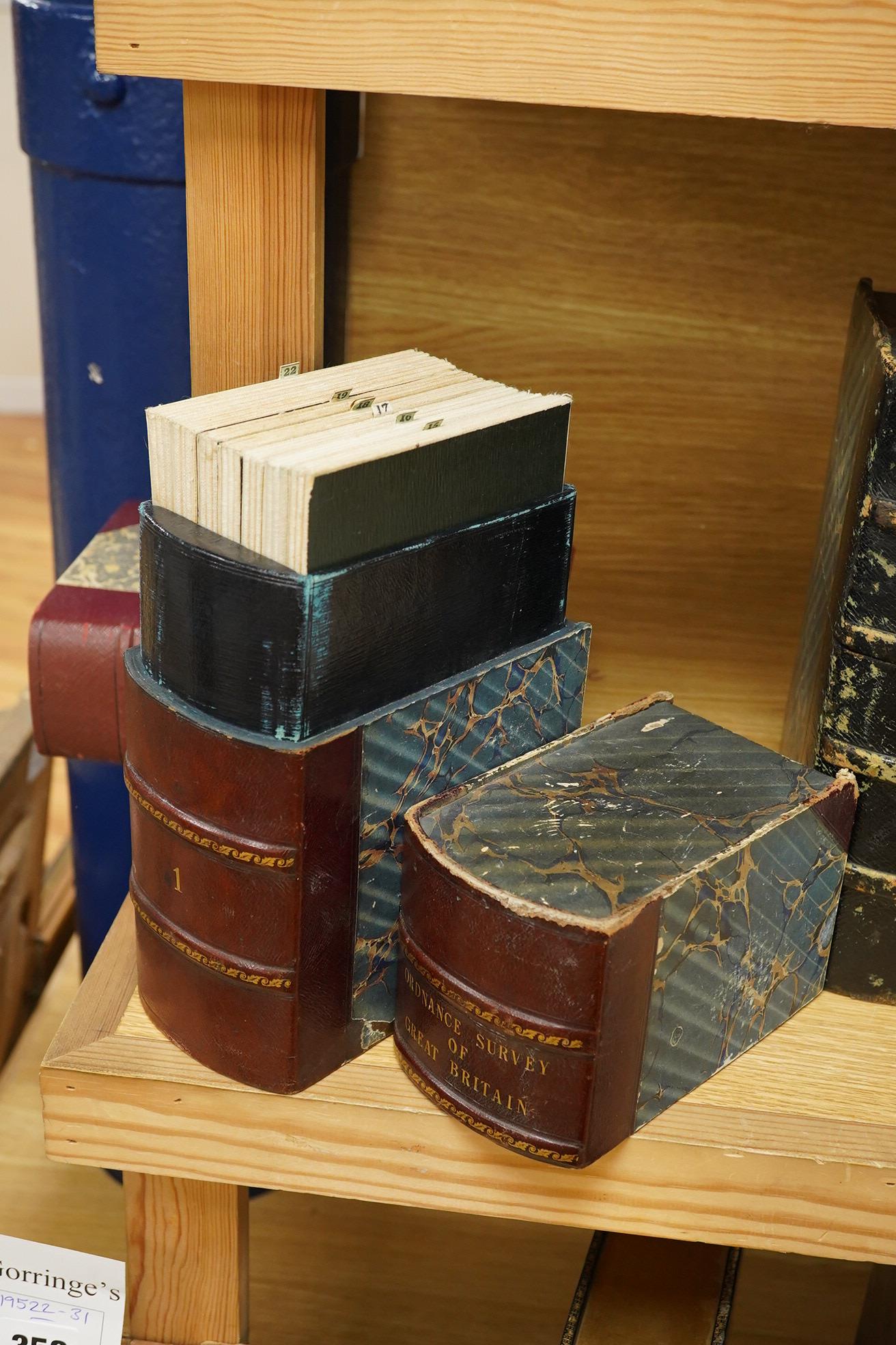 Volume One, Ordnance Survey maps, c.1864, comprising of a set of seven engraved maps mounted on linen covering parts of Somerset, Devon, Dorset, and Hampshire; sheet no.s; 15, 16, 17, 18, 19, 21 and 22, engraved by Benjamin Baker, and published by the Ordnance Survey at the Tower of London by Lt. Col. Mudge, dated 1811, with an applied retail label for Letts, Son & Co., 8, Royal Exchange, in a leather slip case with lid and gilt tooling, disguised as a book
