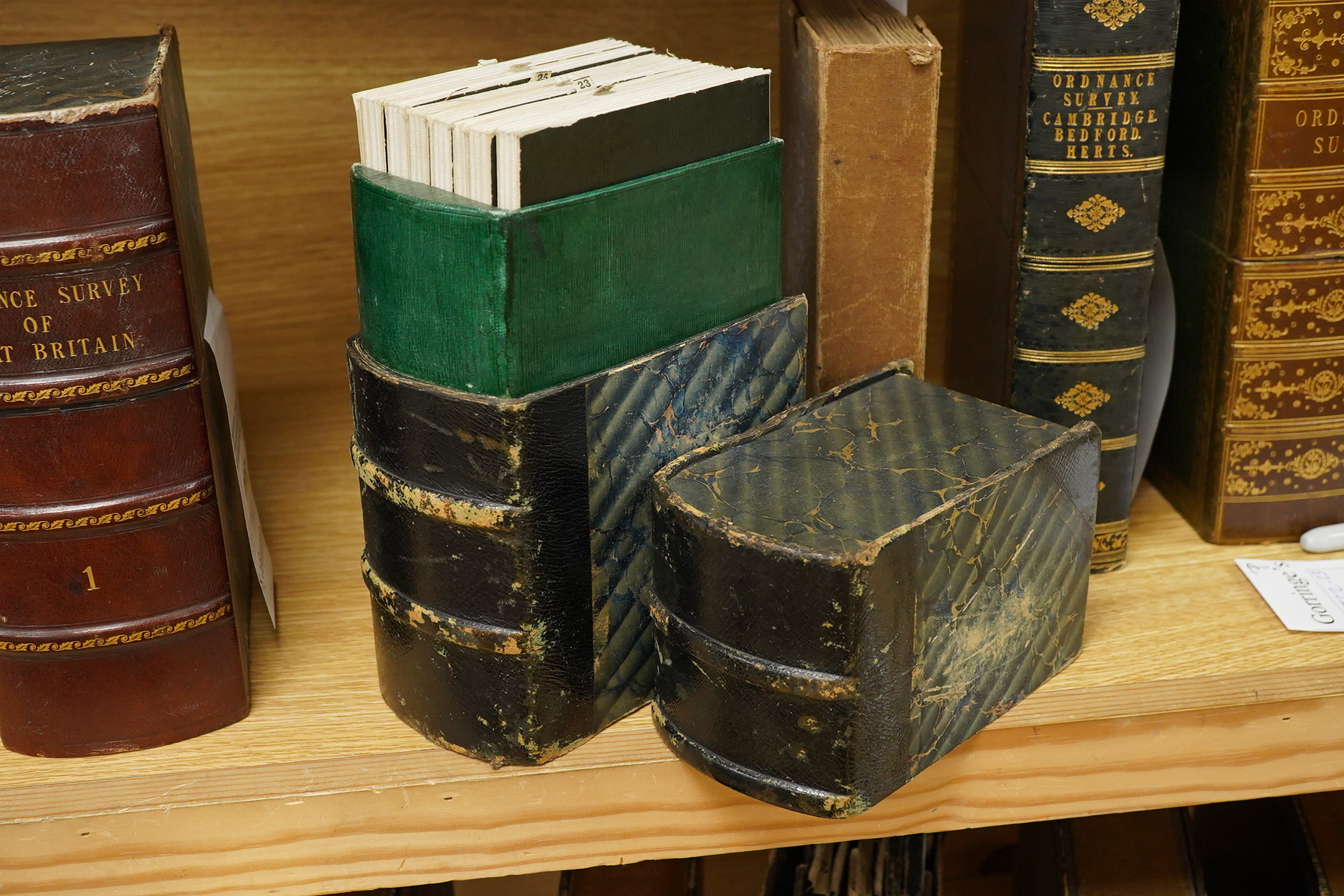 Devon, Ordnance Survey maps, c.1860s, comprising of a set of seven engraved maps mounted on linen covering Devon, sheet no.s; 21, 22, 23, 24, 25, 26 and 27, engraved by Benjamin Baker, and published by the Ordnance Survey at the Tower of London by Lt. Col. Mudge, dated 1809, with an applied retail label for Letts, Son & Co., London, in a half leather slip case with lid disguised as a book