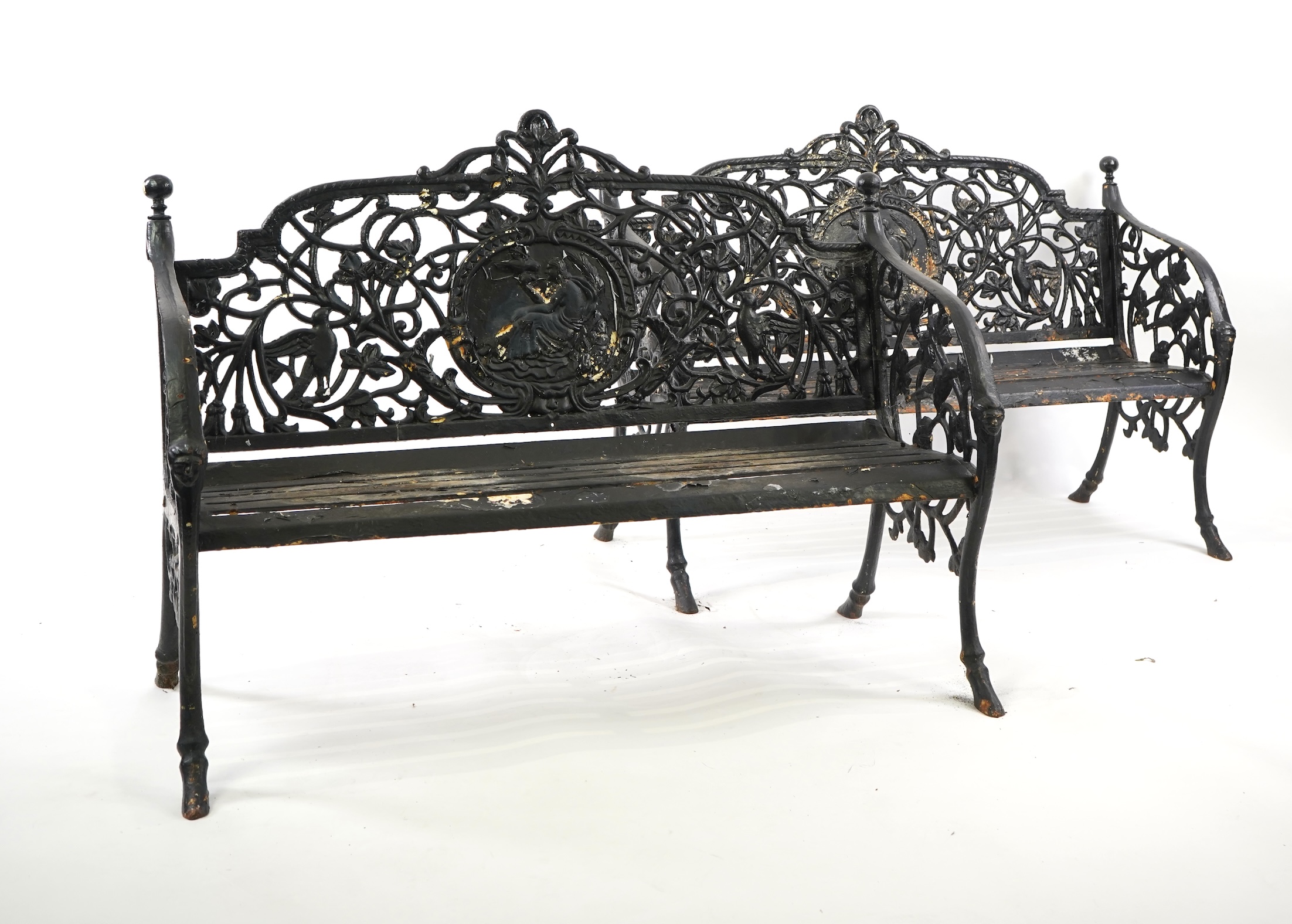 A pair of Victorian Coalbrookdale style painted cast iron medallion garden benches, the pierced backs with central relief cast oval panels depicting seated maidens holding doves over slatted seats on naturalistic bases, 130cm wide, 60cm deep, 97cm high