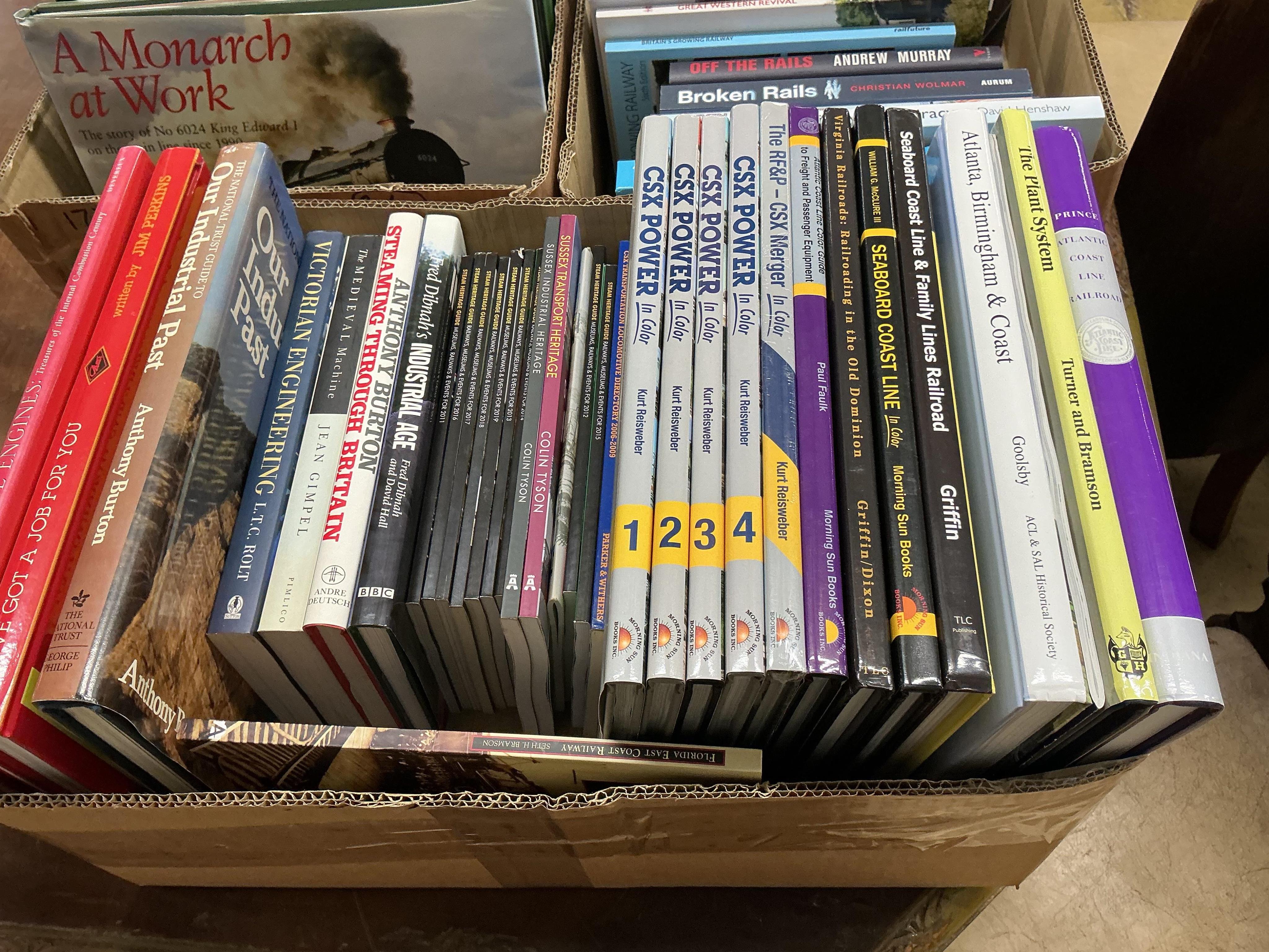 Lot 402 , Three boxes of railway related books, subjects include; Castles & Kings at Work, Great Western Kings, Great Western Steam Rail Motors, Old Marine Engines, Steaming Through Britain, CSX Power, etc., publishers include; Ia