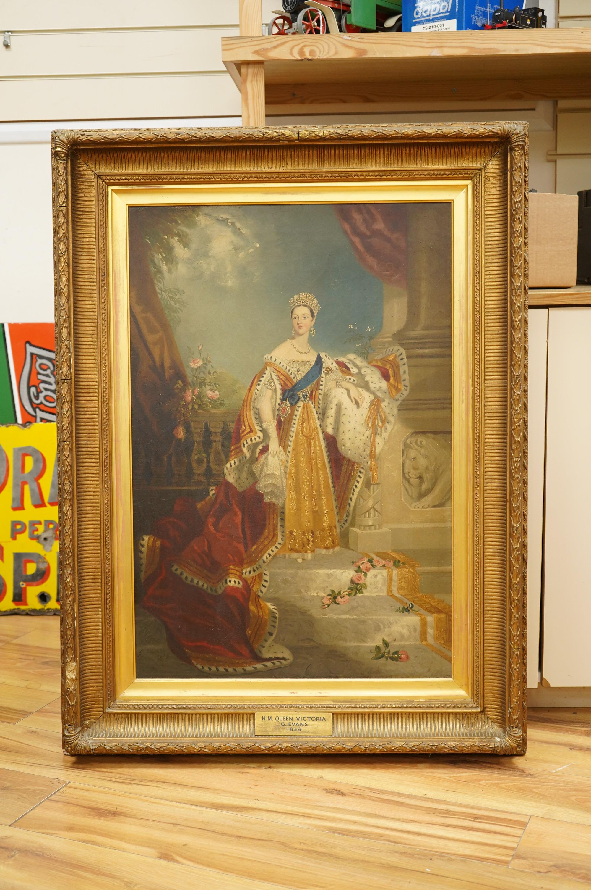 Lot 747 , G. Evans (19th. C), Portrait of Queen Victoria wearing ermine before a landscape, signed and dated 1859, 77 x 52cm, applied plaque to the gilt frame, oil on canvas